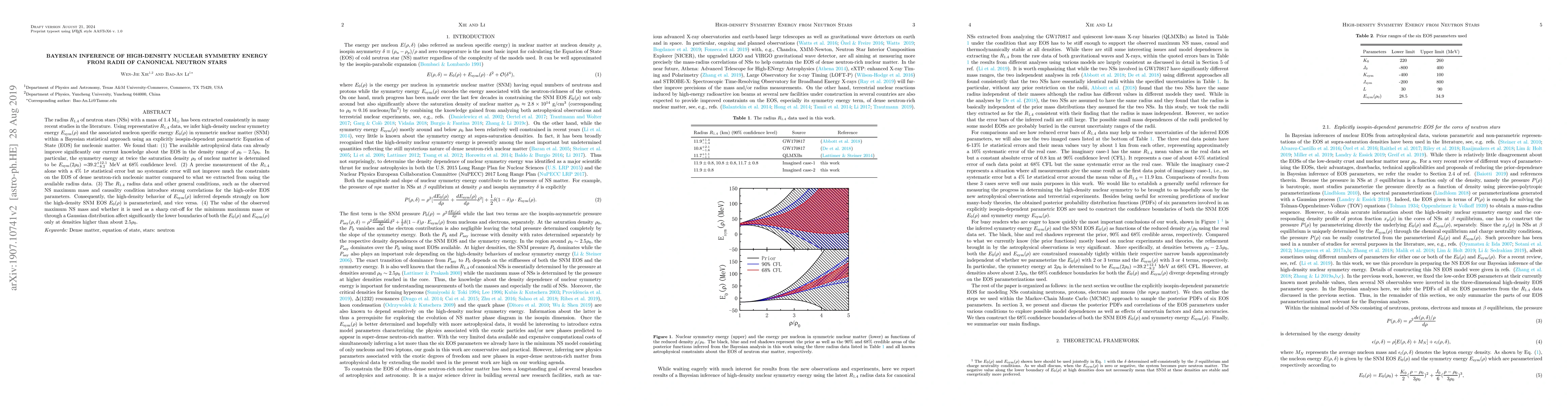 Researchers used neutron star radii to infer nuclear symmetry energy and its associated nucleon specific energy in a Bayesian statistical approach, improving current knowledge of the equation of state in high-density regions.