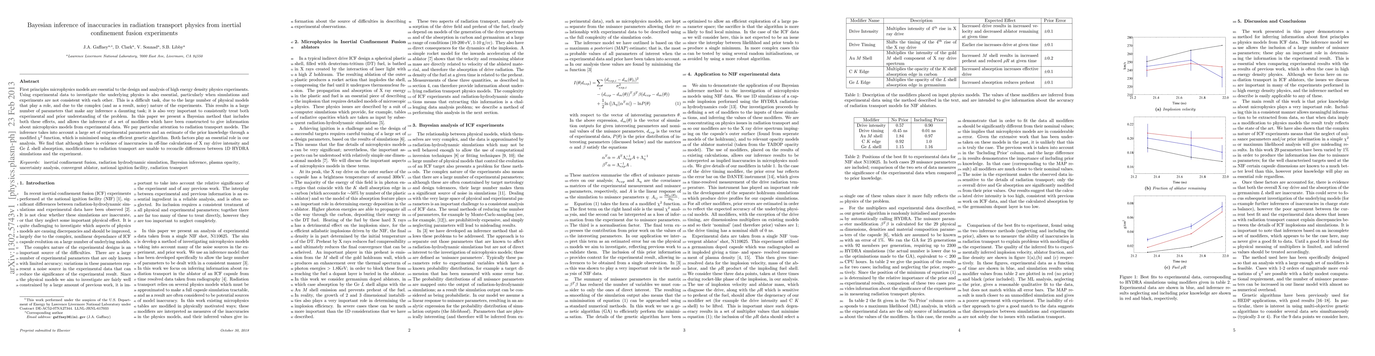 First principles microphysics models are essential to the design and analysis of high energy density physics experiments. Using experimental data to investigate the underlying physics is also essential, particularly when simulations and experiments are not consistent with each other. This is a difficult task, due to the large number of physical models that play a role, and due to the complex (and as a result, noisy) nature of the experiments. This results in a large number of parameters that make any inference a daunting task; it is also very important to consistently treat both experimental and prior understanding of the problem. In this paper we present a Bayesian method that includes both these effects, and allows the inference of a set of modifiers which have been constructed to give information about microphysics models from experimental data. We pay particular attention to radiation transport models. The inference takes into account a large set of experimental parameters and an estimate of the prior knowledge through a modified $\chi^{2}$ function, which is minimised using an efficient genetic algorithm. Both factors play an essential role in our analysis. We find that although there is evidence of inaccuracies in off-line calculations of X ray drive intensity and Ge $L$ shell absorption, modifications to radiation transport are unable to reconcile differences between 1D HYDRA simulations and the experiment.