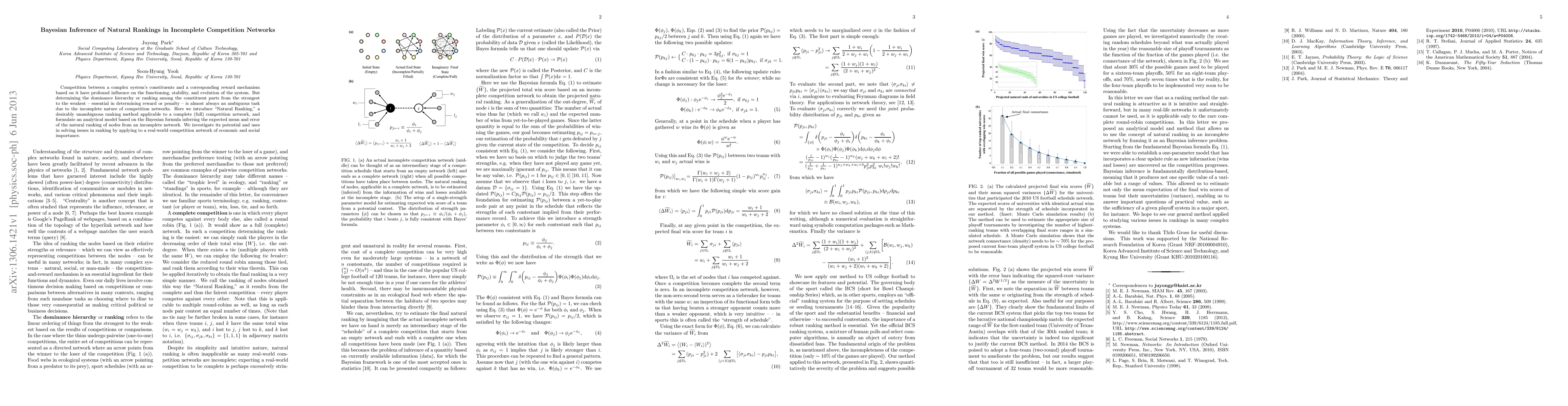 Competition between a complex system's constituents and a corresponding reward mechanism based on it have profound influence on the functioning, stability, and evolution of the system. But determining the dominance hierarchy or ranking among the constituent parts from the strongest to the weakest -- essential in determining reward or penalty -- is almost always an ambiguous task due to the incomplete nature of competition networks. Here we introduce ``Natural Ranking," a desirably unambiguous ranking method applicable to a complete (full) competition network, and formulate an analytical model based on the Bayesian formula inferring the expected mean and error of the natural ranking of nodes from an incomplete network. We investigate its potential and uses in solving issues in ranking by applying to a real-world competition network of economic and social importance.