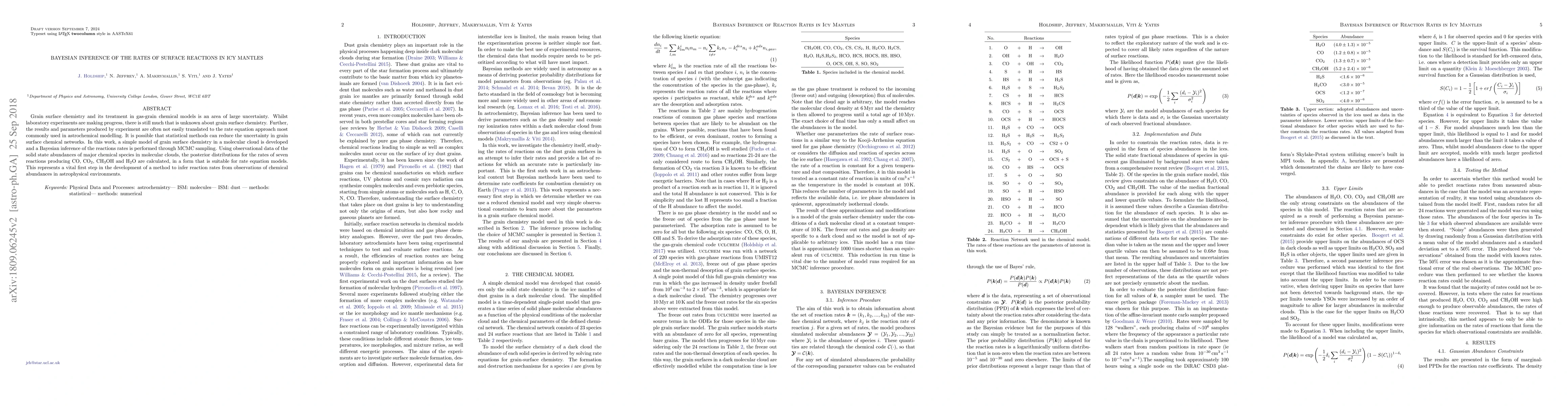 This paper develops a Bayesian inference method to estimate reaction rates in icy mantles using MCMC sampling, aiming to reduce uncertainties in grain surface chemistry models. The posterior distributions for seven key reaction rates producing major chemical species are derived from observational data, providing a foundation for integrating observational data into astrochemical models.