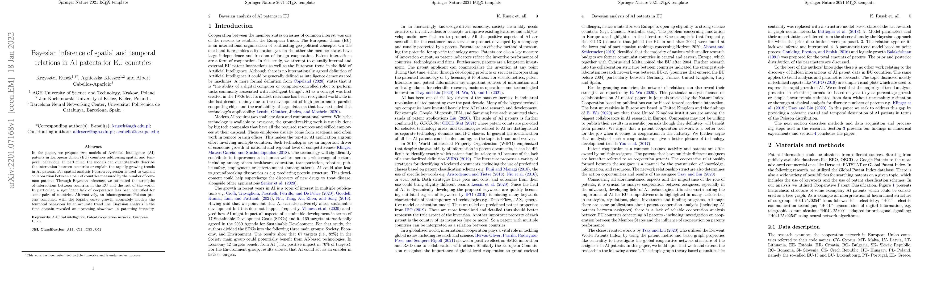 In the paper, we propose two models of Artificial Intelligence (AI) patents in European Union (EU) countries addressing spatial and temporal behaviour. In particular, the models can quantitatively describe the interaction between countries or explain the rapidly growing trends in AI patents. For spatial analysis Poisson regression is used to explain collaboration between a pair of countries measured by the number of common patents. Through Bayesian inference, we estimated the strengths of interactions between countries in the EU and the rest of the world. In particular, a significant lack of cooperation has been identified for some pairs of countries. Alternatively, an inhomogeneous Poisson process combined with the logistic curve growth accurately models the temporal behaviour by an accurate trend line. Bayesian analysis in the time domain revealed an upcoming slowdown in patenting intensity.