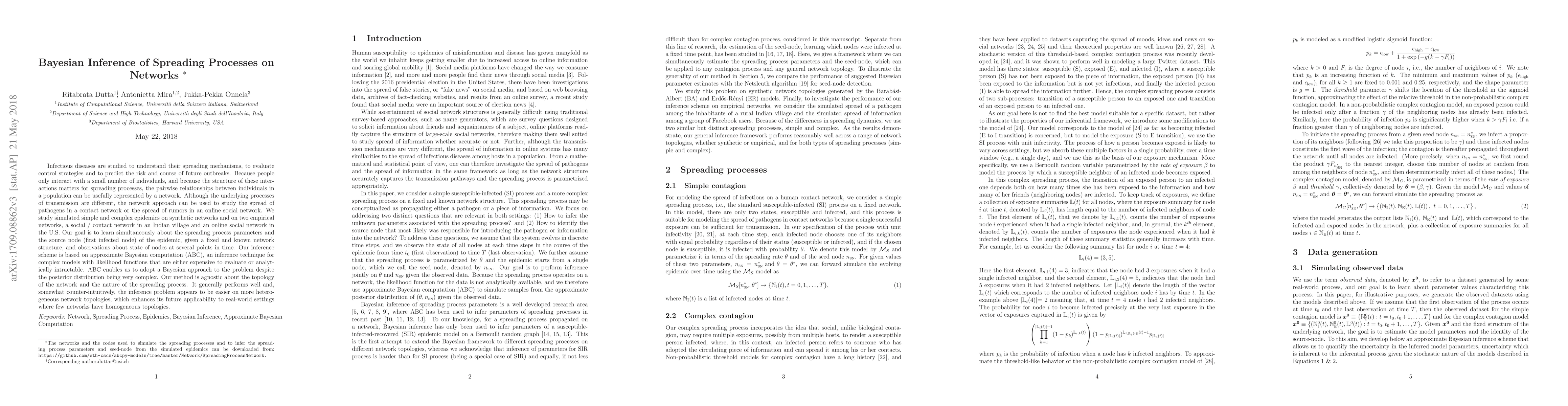 This paper employs Bayesian inference via approximate Bayesian computation (ABC) to model the spread of infectious diseases and rumors on both synthetic and real-world networks. The method is effective in identifying epidemic parameters and the initial infection source, performing well especially on heterogeneous network structures.