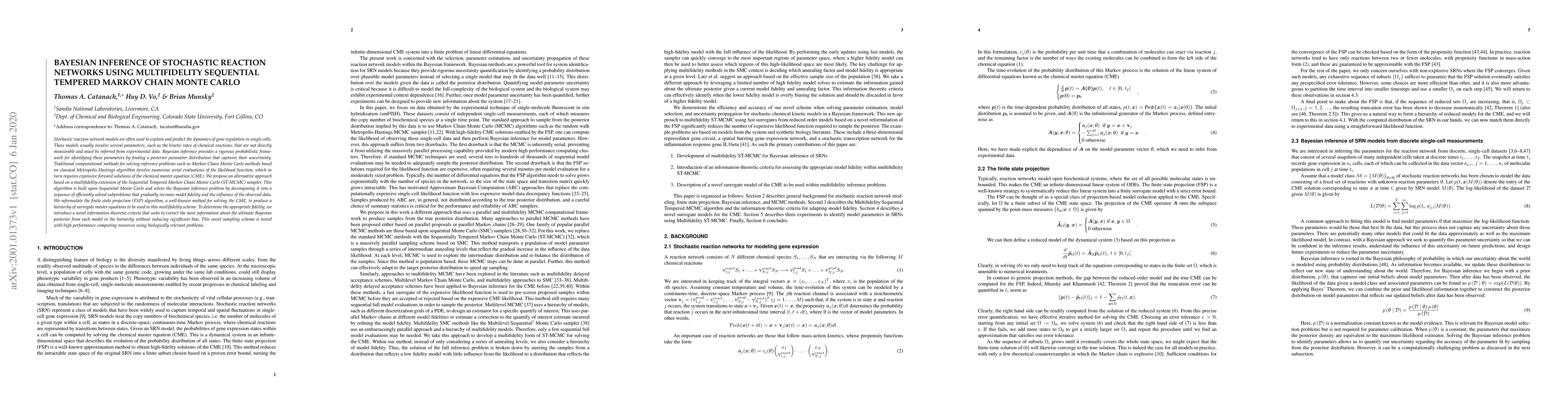 Stochastic reaction network models are often used to explain and predict the dynamics of gene regulation in single cells. These models usually involve several parameters, such as the kinetic rates of chemical reactions, that are not directly measurable and must be inferred from experimental data. Bayesian inference provides a rigorous probabilistic framework for identifying these parameters by finding a posterior parameter distribution that captures their uncertainty. Traditional computational methods for solving inference problems such as Markov Chain Monte Carlo methods based on classical Metropolis-Hastings algorithm involve numerous serial evaluations of the likelihood function, which in turn requires expensive forward solutions of the chemical master equation (CME). We propose an alternative approach based on a multifidelity extension of the Sequential Tempered Markov Chain Monte Carlo (ST-MCMC) sampler. This algorithm is built upon Sequential Monte Carlo and solves the Bayesian inference problem by decomposing it into a sequence of efficiently solved subproblems that gradually increase model fidelity and the influence of the observed data. We reformulate the finite state projection (FSP) algorithm, a well-known method for solving the CME, to produce a hierarchy of surrogate master equations to be used in this multifidelity scheme. To determine the appropriate fidelity, we introduce a novel information-theoretic criteria that seeks to extract the most information about the ultimate Bayesian posterior from each model in the hierarchy without inducing significant bias. This novel sampling scheme is tested with high performance computing resources using biologically relevant problems.