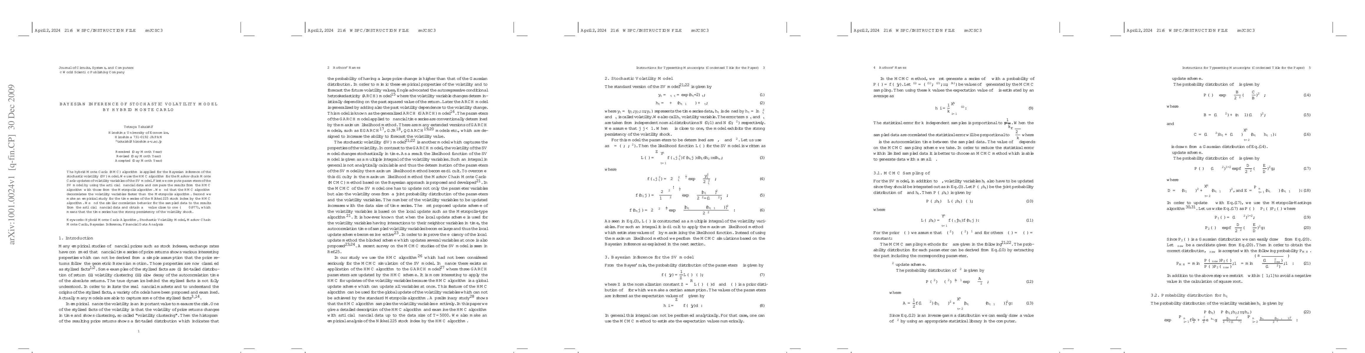 This paper applies the hybrid Monte Carlo (HMC) algorithm for Bayesian inference in a stochastic volatility model, demonstrating faster decorrelation of volatility variables compared to the Metropolis algorithm using both artificial financial data and real Nikkei 225 stock index data, revealing strong volatility shock persistence ($\phi \approx 0.977$).