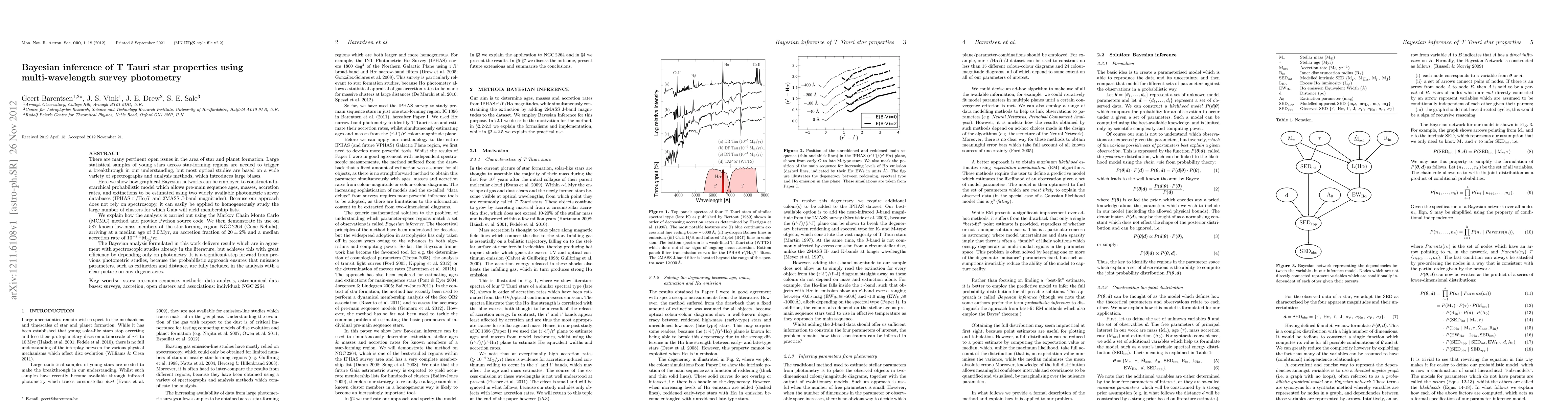 There are many pertinent open issues in the area of star and planet formation. Large statistical samples of young stars across star-forming regions are needed to trigger a breakthrough in our understanding, but most optical studies are based on a wide variety of spectrographs and analysis methods, which introduces large biases. Here we show how graphical Bayesian networks can be employed to construct a hierarchical probabilistic model which allows pre-main sequence ages, masses, accretion rates, and extinctions to be estimated using two widely available photometric survey databases (IPHAS r/i/Halpha and 2MASS J-band magnitudes.) Because our approach does not rely on spectroscopy, it can easily be applied to homogeneously study the large number of clusters for which Gaia will yield membership lists. We explain how the analysis is carried out using the Markov Chain Monte Carlo (MCMC) method and provide Python source code. We then demonstrate its use on 587 known low-mass members of the star-forming region NGC 2264 (Cone Nebula), arriving at a median age of 3.0 Myr, an accretion fraction of 20+/-2% and a median accretion rate of 10^-8.4 Msol/yr. The Bayesian analysis formulated in this work delivers results which are in agreement with spectroscopic studies already in the literature, but achieves this with great efficiency by depending only on photometry. It is a significant step forward from previous photometric studies, because the probabilistic approach ensures that nuisance parameters, such as extinction and distance, are fully included in the analysis with a clear picture on any degeneracies.
