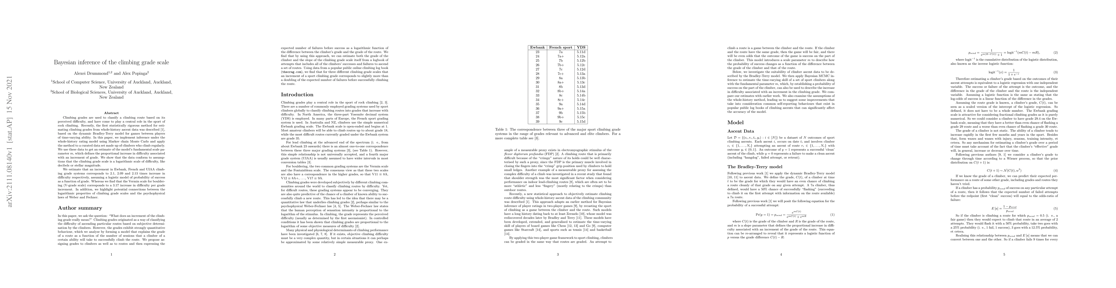 This paper uses Bayesian inference and Markov chain Monte Carlo to estimate climbing grade scales based on historical ascent data, finding that the Ewbank, French, UIAA, and Vermin scales correspond to logarithmic increases in difficulty, with respective multipliers of 2.1, 2.09, 2.13, and 3.17. It also draws parallels between these scales and psychophysical laws.