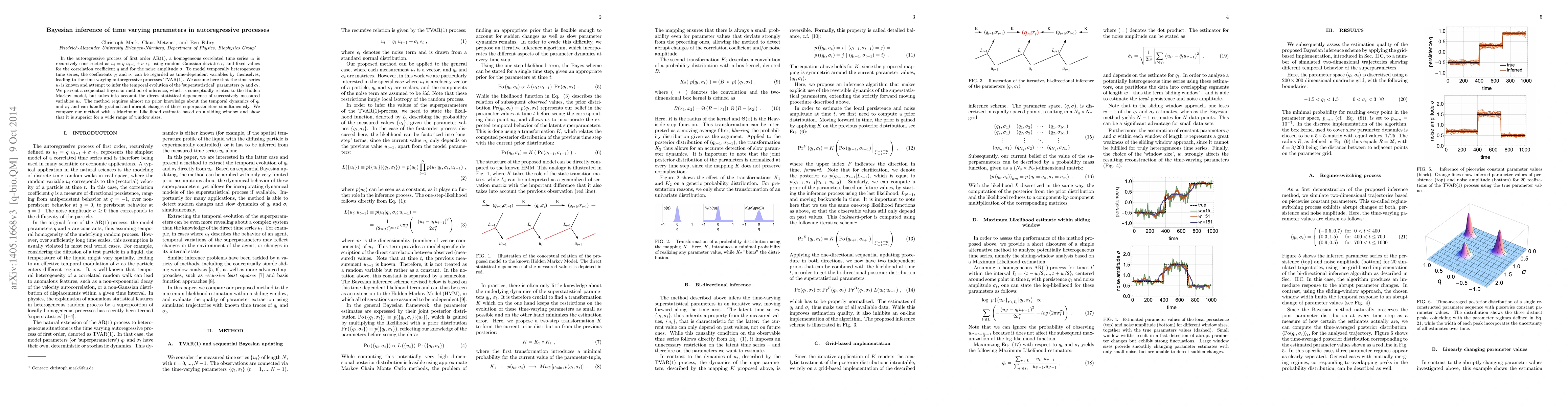 In the autoregressive process of first order AR(1), a homogeneous correlated time series $u_t$ is recursively constructed as $u_t = q\; u_{t-1} + \sigma \;\epsilon_t$, using random Gaussian deviates $\epsilon_t$ and fixed values for the correlation coefficient $q$ and for the noise amplitude $\sigma$. To model temporally heterogeneous time series, the coefficients $q_t$ and $\sigma_t$ can be regarded as time-dependend variables by themselves, leading to the time-varying autoregressive processes TVAR(1). We assume here that the time series $u_t$ is known and attempt to infer the temporal evolution of the 'superstatistical' parameters $q_t$ and $\sigma_t$. We present a sequential Bayesian method of inference, which is conceptually related to the Hidden Markov model, but takes into account the direct statistical dependence of successively measured variables $u_t$. The method requires almost no prior knowledge about the temporal dynamics of $q_t$ and $\sigma_t$ and can handle gradual and abrupt changes of these superparameters simultaneously. We compare our method with a Maximum Likelihood estimate based on a sliding window and show that it is superior for a wide range of window sizes.