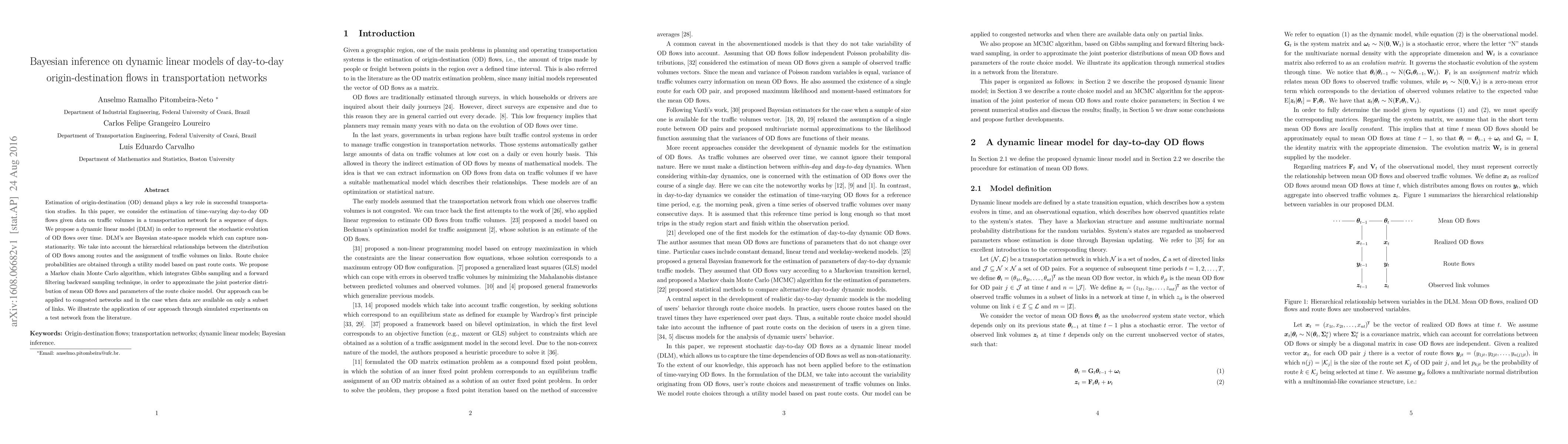 This paper proposes a dynamic linear model for estimating time-varying origin-destination flows in transportation networks using Bayesian inference. The approach incorporates a Markov chain Monte Carlo algorithm to approximate the joint posterior distribution, enabling the estimation of OD flows even in congested networks and partial data scenarios.