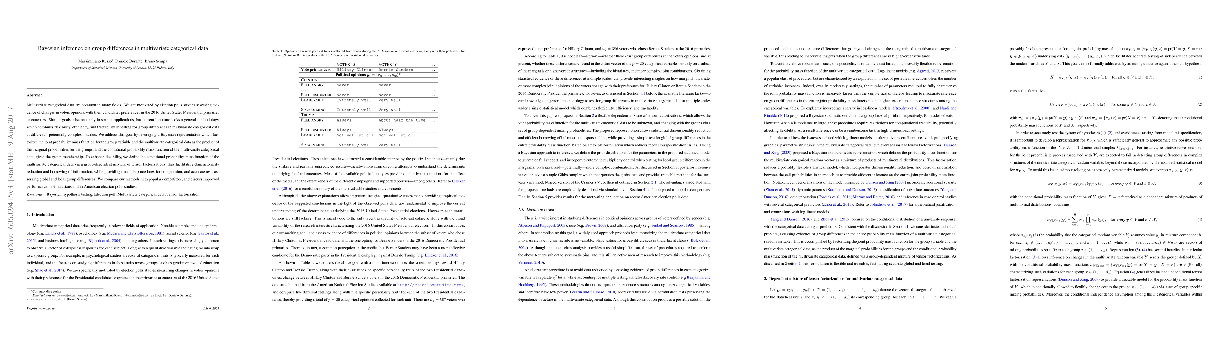 Multivariate categorical data are common in many fields. We are motivated by election polls studies assessing evidence of changes in voters opinions with their candidates preferences in the 2016 United States Presidential primaries or caucuses. Similar goals arise routinely in several applications, but current literature lacks a general methodology which combines flexibility, efficiency, and tractability in testing for group differences in multivariate categorical data at different---potentially complex---scales. We address this goal by leveraging a Bayesian representation which factorizes the joint probability mass function for the group variable and the multivariate categorical data as the product of the marginal probabilities for the groups, and the conditional probability mass function of the multivariate categorical data, given the group membership. To enhance flexibility, we define the conditional probability mass function of the multivariate categorical data via a group-dependent mixture of tensor factorizations, thus facilitating dimensionality reduction and borrowing of information, while providing tractable procedures for computation, and accurate tests assessing global and local group differences. We compare our methods with popular competitors, and discuss improved performance in simulations and in American election polls studies.