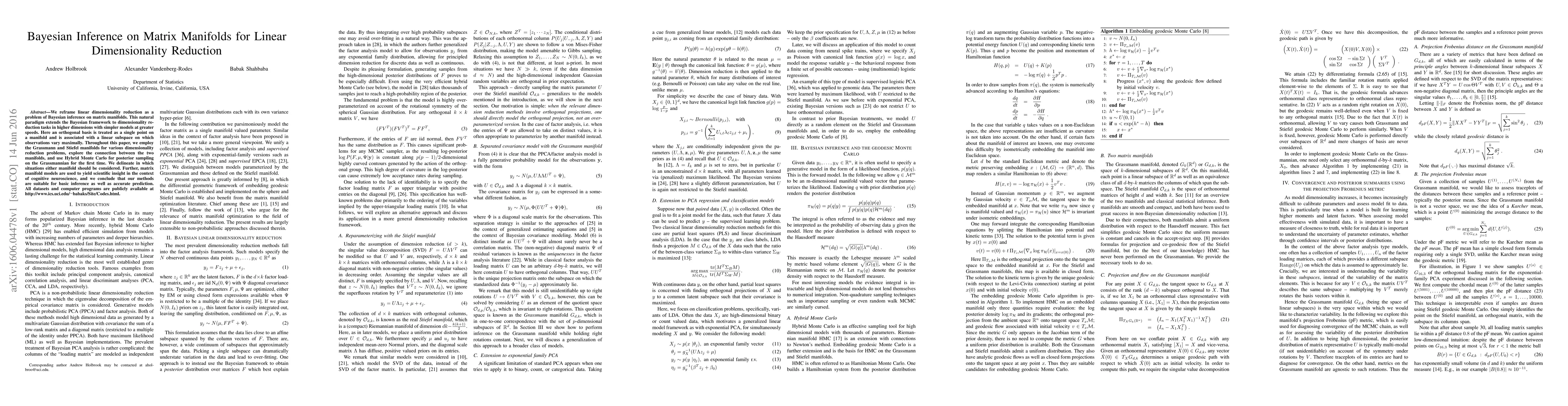 This paper proposes a Bayesian inference framework on matrix manifolds for linear dimensionality reduction, employing Grassmann and Stiefel manifolds for efficient modeling. The authors utilize Hybrid Monte Carlo for posterior sampling and demonstrate the effectiveness of their methods in cognitive neuroscience applications.