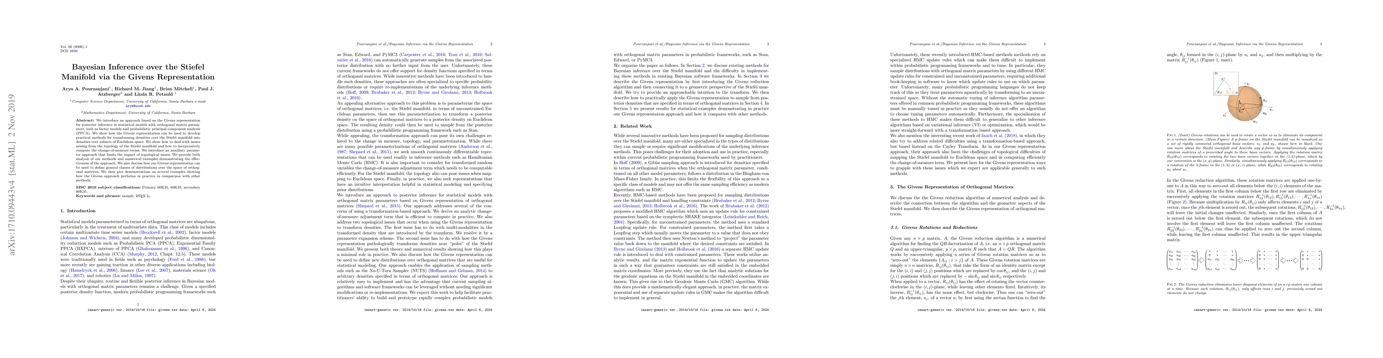We introduce an approach based on the Givens representation for posterior inference in statistical models with orthogonal matrix parameters, such as factor models and probabilistic principal component analysis (PPCA). We show how the Givens representation can be used to develop practical methods for transforming densities over the Stiefel manifold into densities over subsets of Euclidean space. We show how to deal with issues arising from the topology of the Stiefel manifold and how to inexpensively compute the change-of-measure terms. We introduce an auxiliary parameter approach that limits the impact of topological issues. We provide both analysis of our methods and numerical examples demonstrating the effectiveness of the approach. We also discuss how our Givens representation can be used to define general classes of distributions over the space of orthogonal matrices. We then give demonstrations on several examples showing how the Givens approach performs in practice in comparison with other methods.