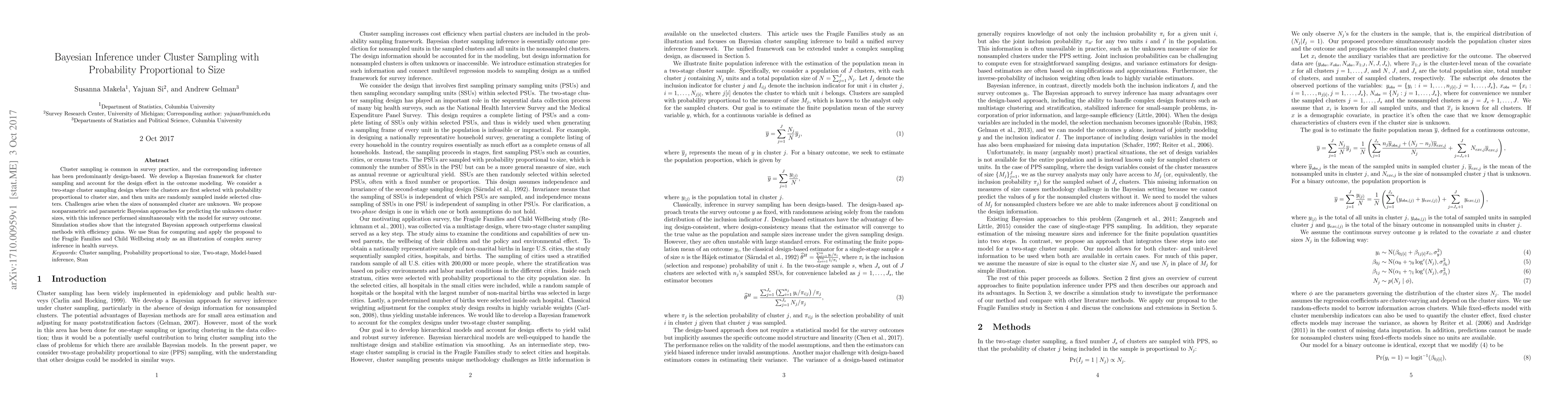 This paper develops a Bayesian framework for cluster sampling with probability proportional to size, addressing unknown nonsampled cluster sizes through nonparametric and parametric Bayesian approaches. Simulation studies demonstrate the efficiency of the proposed integrated Bayesian method over classical methods, with an application to the Fragile Families and Child Wellbeing study.