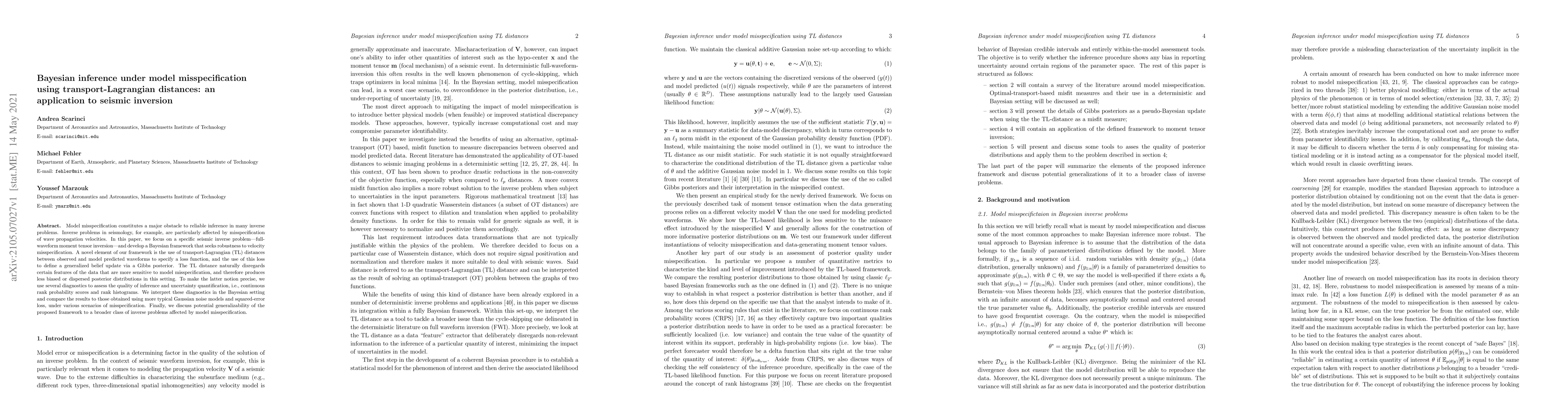 This paper develops a Bayesian framework for seismic inversion that uses transport-Lagrangian distances to mitigate the effects of model misspecification, achieving more reliable inference and uncertainty quantification compared to traditional methods. The proposed method shows improved diagnostics for assessing inference quality in the presence of misspecification.
