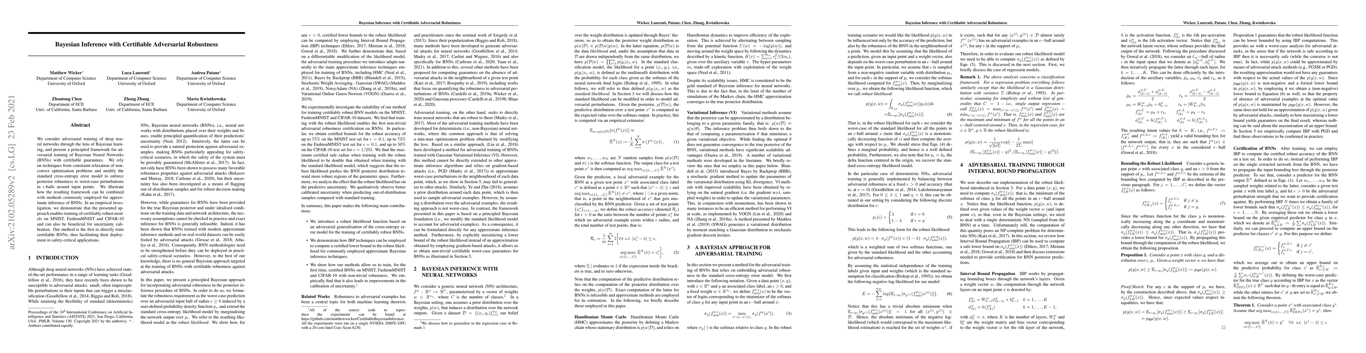 We consider adversarial training of deep neural networks through the lens of Bayesian learning, and present a principled framework for adversarial training of Bayesian Neural Networks (BNNs) with certifiable guarantees. We rely on techniques from constraint relaxation of non-convex optimisation problems and modify the standard cross-entropy error model to enforce posterior robustness to worst-case perturbations in $\epsilon$-balls around input points. We illustrate how the resulting framework can be combined with methods commonly employed for approximate inference of BNNs. In an empirical investigation, we demonstrate that the presented approach enables training of certifiably robust models on MNIST, FashionMNIST and CIFAR-10 and can also be beneficial for uncertainty calibration. Our method is the first to directly train certifiable BNNs, thus facilitating their deployment in safety-critical applications.