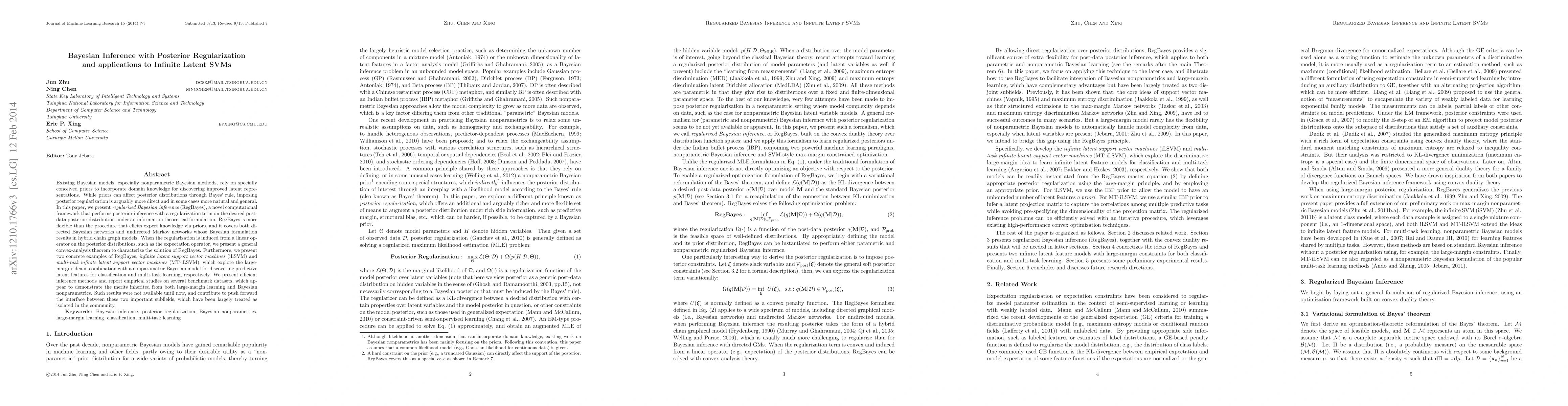 This paper introduces regularized Bayesian inference (RegBayes) as a flexible framework for posterior inference using regularization instead of priors, applicable to both directed and undirected Bayesian networks. It demonstrates RegBayes through infinite latent support vector machines (iLSVM) and multi-task iLSVM, showing their effectiveness in classification and multi-task learning by combining large-margin learning with Bayesian nonparametrics.