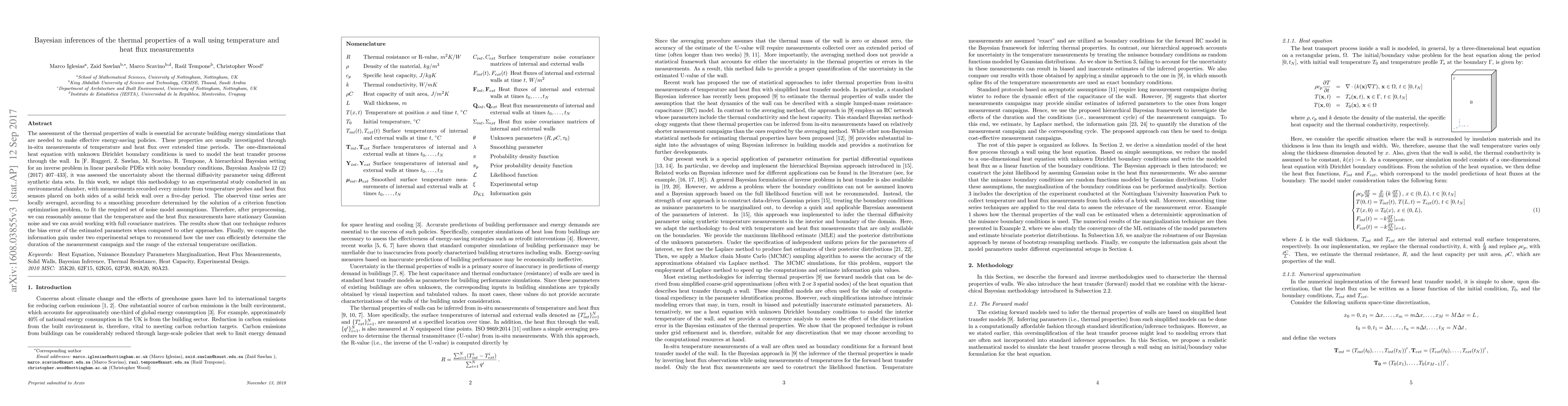 The assessment of the thermal properties of walls is essential for accurate building energy simulations that are needed to make effective energy-saving policies. These properties are usually investigated through in-situ measurements of temperature and heat flux over extended time periods. The one-dimensional heat equation with unknown Dirichlet boundary conditions is used to model the heat transfer process through the wall. In [F. Ruggeri, Z. Sawlan, M. Scavino, R. Tempone, A hierarchical Bayesian setting for an inverse problem in linear parabolic PDEs with noisy boundary conditions, Bayesian Analysis 12 (2) (2017) 407--433], it was assessed the uncertainty about the thermal diffusivity parameter using different synthetic data sets. In this work, we adapt this methodology to an experimental study conducted in an environmental chamber, with measurements recorded every minute from temperature probes and heat flux sensors placed on both sides of a solid brick wall over a five-day period. The observed time series are locally averaged, according to a smoothing procedure determined by the solution of a criterion function optimization problem, to fit the required set of noise model assumptions. Therefore, after preprocessing, we can reasonably assume that the temperature and the heat flux measurements have stationary Gaussian noise and we can avoid working with full covariance matrices. The results show that our technique reduces the bias error of the estimated parameters when compared to other approaches. Finally, we compute the information gain under two experimental setups to recommend how the user can efficiently determine the duration of the measurement campaign and the range of the external temperature oscillation.