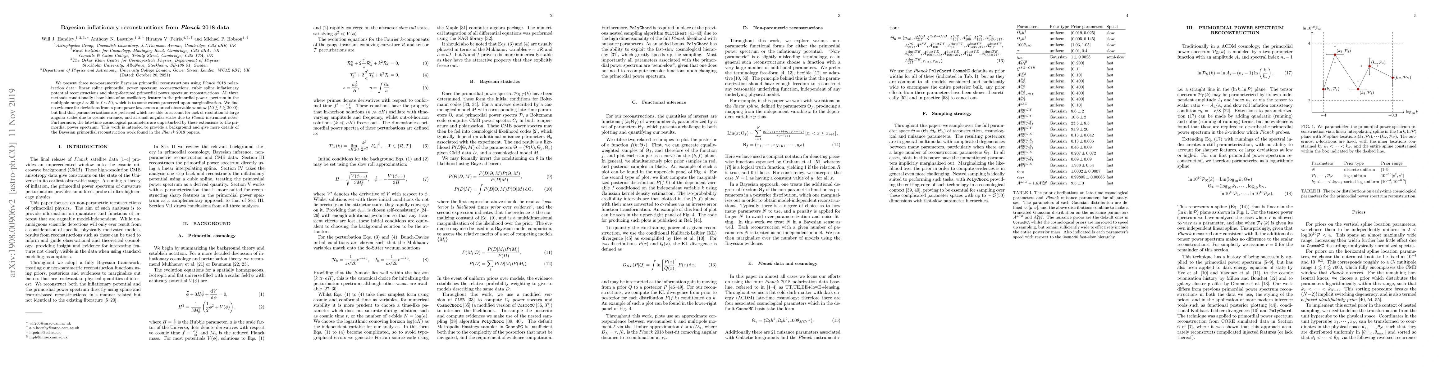 We present three non-parametric Bayesian primordial reconstructions using Planck 2018 polarization data: linear spline primordial power spectrum reconstructions, cubic spline inflationary potential reconstructions and sharp-featured primordial power spectrum reconstructions. All three methods conditionally show hints of an oscillatory feature in the primordial power spectrum in the multipole range $\ell\sim20$ to $\ell\sim50$, which is to some extent preserved upon marginalization. We find no evidence for deviations from a pure power law across a broad observable window ($50\lesssim\ell\lesssim2000$), but find that parameterizations are preferred which are able to account for lack of resolution at large angular scales due to cosmic variance, and at small angular scales due to Planck instrument noise. Furthermore, the late-time cosmological parameters are unperturbed by these extensions to the primordial power spectrum. This work is intended to provide a background and give more details of the Bayesian primordial reconstruction work found in the Planck 2018 papers.