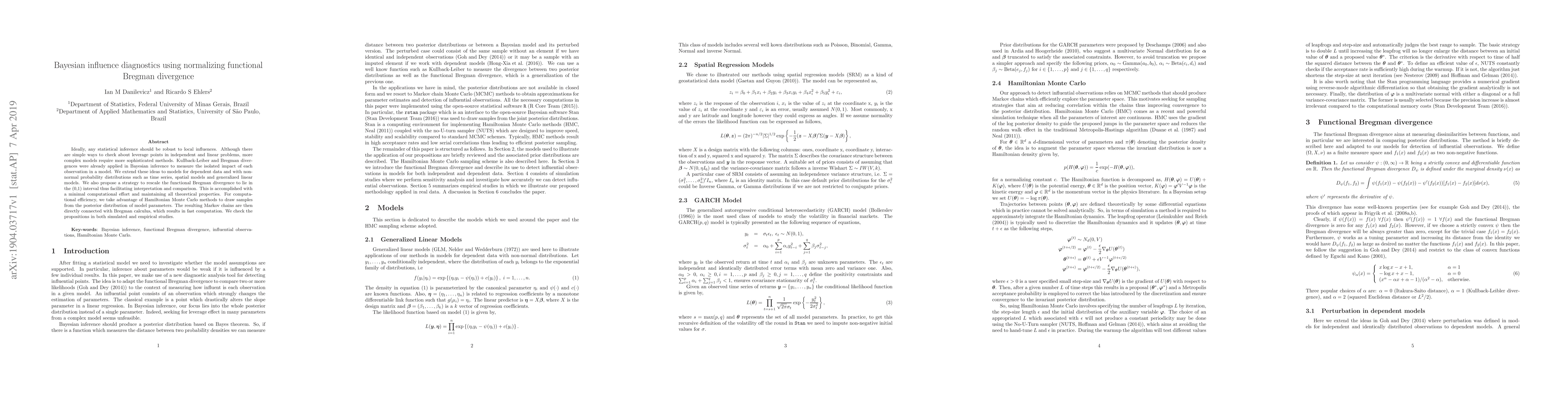 This paper proposes Bayesian influence diagnostics using normalizing functional Bregman divergence for complex models like time series and spatial models. It introduces a rescaling method for Bregman divergence to facilitate interpretation and employs Hamiltonian Monte Carlo for efficient computation.