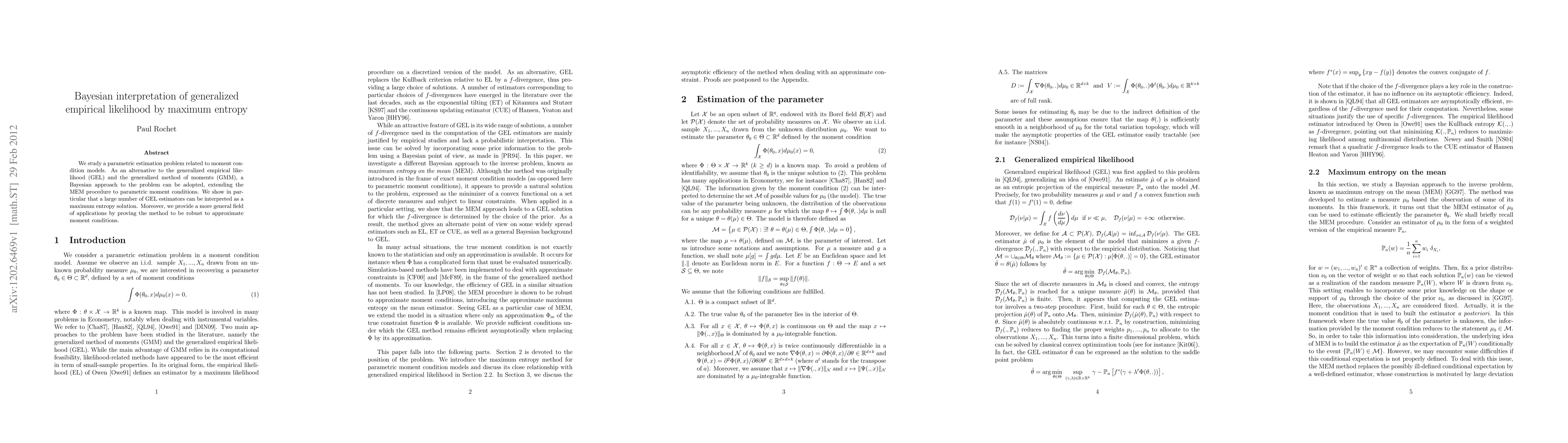 The paper presents a Bayesian interpretation of Generalized Empirical Likelihood (GEL) using Maximum Entropy (MEM) principles, extending MEM to parametric moment conditions. It demonstrates that many GEL estimators can be viewed as maximum entropy solutions and proves the method's robustness to approximate moment conditions.