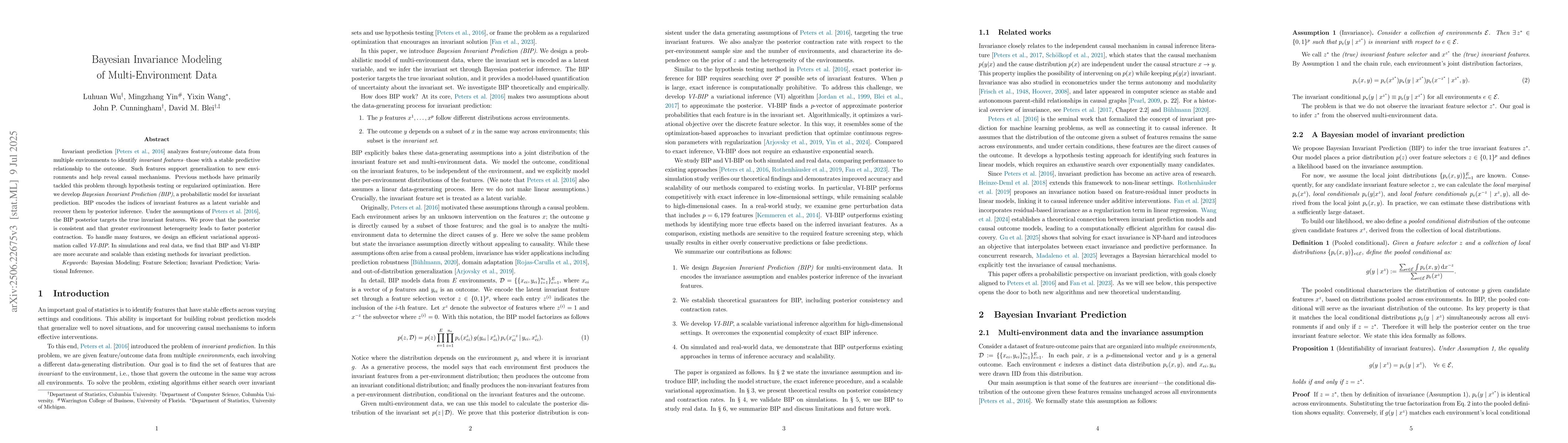 Invariant prediction [Peters et al., 2016] analyzes feature/outcome data from multiple environments to identify invariant features - those with a stable predictive relationship to the outcome. Such features support generalization to new environments and help reveal causal mechanisms. Previous methods have primarily tackled this problem through hypothesis testing or regularized optimization. Here we develop Bayesian Invariant Prediction (BIP), a probabilistic model for invariant prediction. BIP encodes the indices of invariant features as a latent variable and recover them by posterior inference. Under the assumptions of Peters et al. [2016], the BIP posterior targets the true invariant features. We prove that the posterior is consistent and that greater environment heterogeneity leads to faster posterior contraction. To handle many features, we design an efficient variational approximation called VI-BIP. In simulations and real data, we find that BIP and VI-BIP are more accurate and scalable than existing methods for invariant prediction.