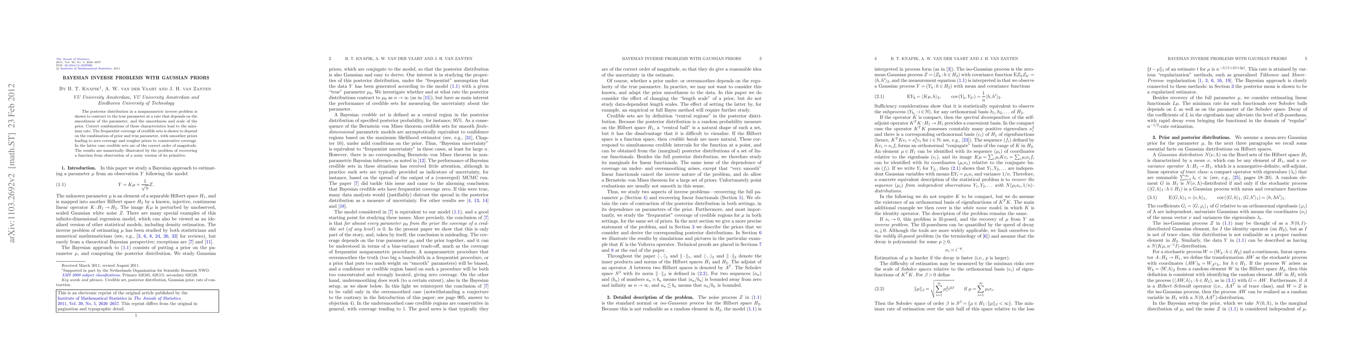 This paper investigates Bayesian methods for nonparametric inverse problems, demonstrating that the posterior distribution converges to the true parameter at a rate influenced by the parameter's smoothness and the prior's characteristics. It finds that optimal prior choices achieve the minimax rate, while inappropriate priors result in either zero or overly conservative coverage of credible sets.