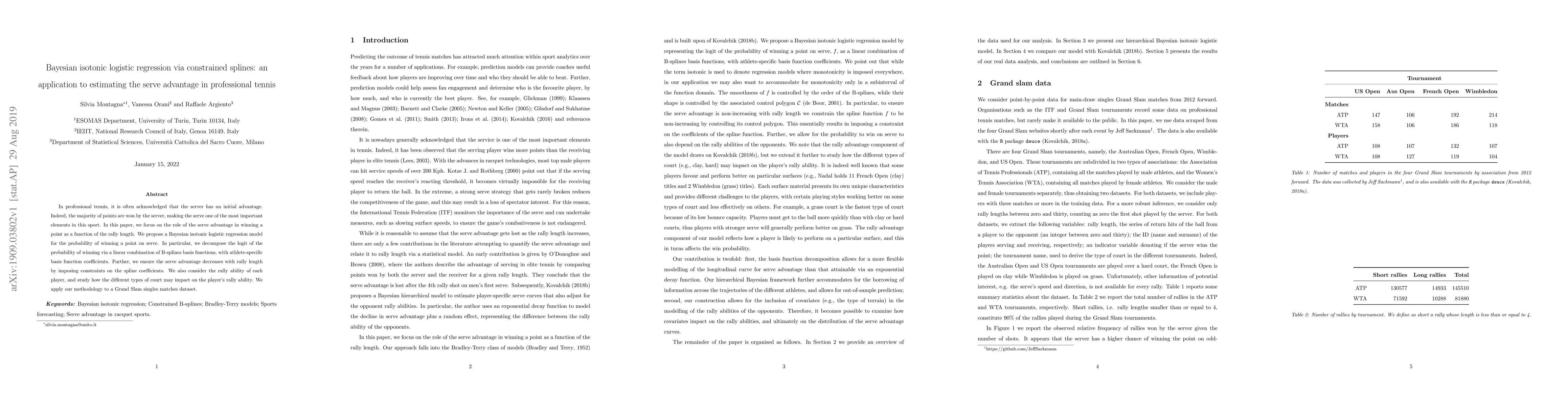 In professional tennis, it is often acknowledged that the server has an initial advantage. Indeed, the majority of points are won by the server, making the serve one of the most important elements in this sport. In this paper, we focus on the role of the serve advantage in winning a point as a function of the rally length. We propose a Bayesian isotonic logistic regression model for the probability of winning a point on serve. In particular, we decompose the logit of the probability of winning via a linear combination of B-splines basis functions, with athlete-specific basis function coefficients. Further, we ensure the serve advantage decreases with rally length by imposing constraints on the spline coefficients. We also consider the rally ability of each player, and study how the different types of court may impact on the player's rally ability. We apply our methodology to a Grand Slam singles matches dataset.