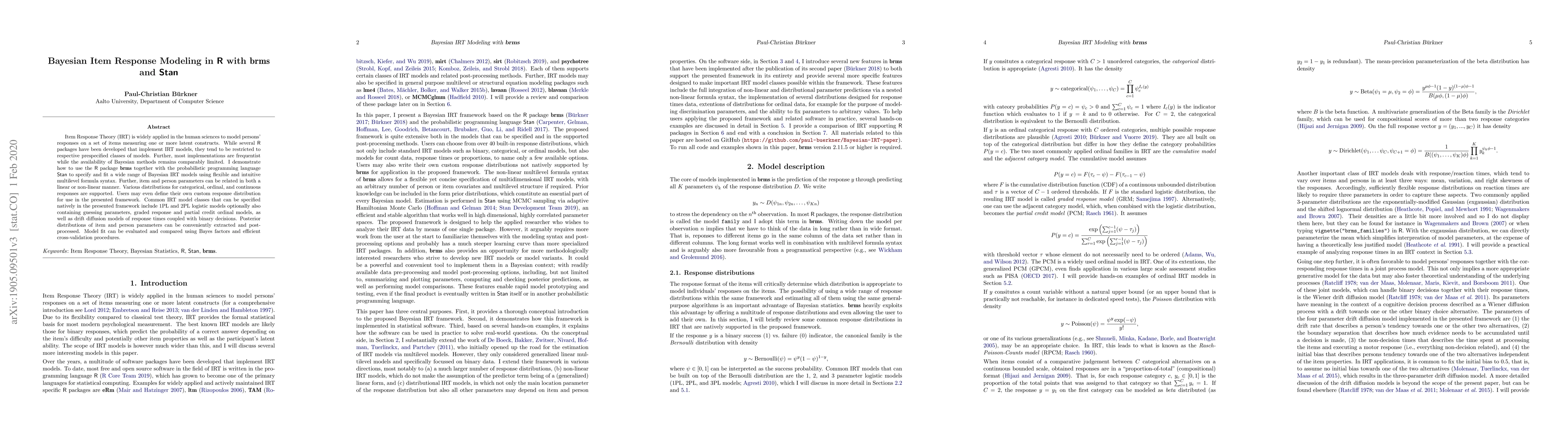 This paper demonstrates the use of the R package brms in conjunction with Stan to specify and fit a wide range of Bayesian Item Response Theory (IRT) models, offering flexibility in modeling and supporting various distributions for different response types. It enables the specification of common IRT models and facilitates model evaluation using Bayes factors and cross-validation.