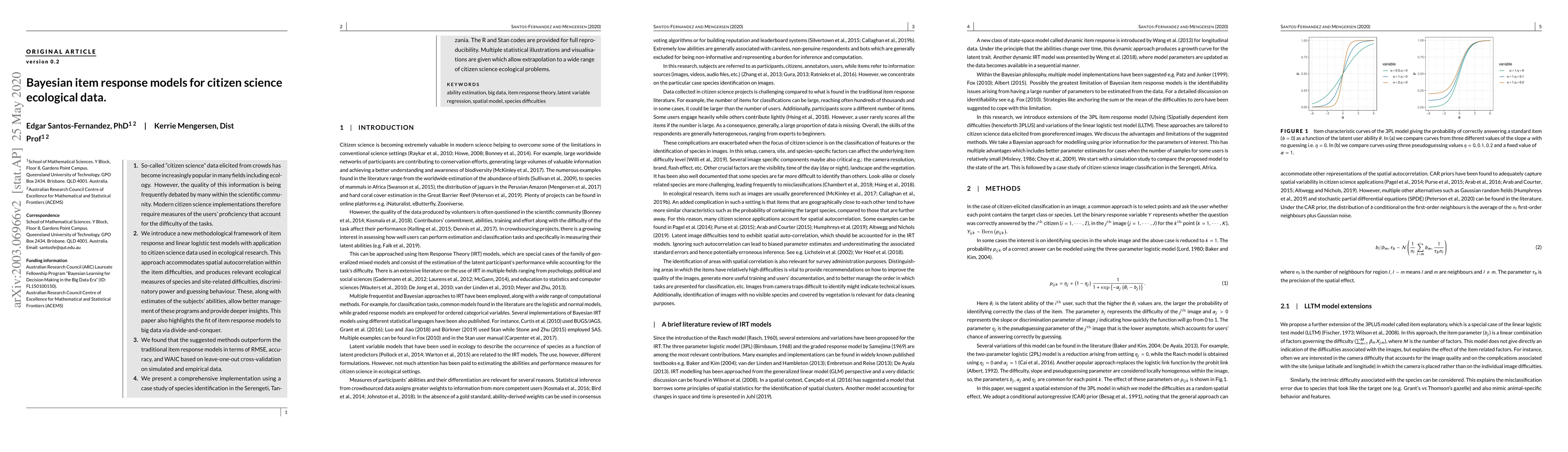 So-called 'citizen science' data elicited from crowds has become increasingly popular in many fields including ecology. However, the quality of this information is being frequently debated by many within the scientific community. Therefore, modern citizen science implementations require measures of the users' proficiency that account for the difficulty of the tasks. We introduce a new methodological framework of item response and linear logistic test models with application to citizen science data used in ecology research. This approach accommodates spatial autocorrelation within the item difficulties and produces relevant ecological measures of species and site-related difficulties, discriminatory power and guessing behavior. These, along with estimates of the subject abilities allow better management of these programs and provide deeper insights. This paper also highlights the fit of item response models to big data via divide-and-conquer. We found that the suggested methods outperform the traditional item response models in terms of RMSE, accuracy, and WAIC based on leave-one-out cross-validation on simulated and empirical data. We present a comprehensive implementation using a case study of species identification in the Serengeti, Tanzania. The R and Stan codes are provided for full reproducibility. Multiple statistical illustrations and visualizations are given which allow practitioners the extrapolation to a wide range of citizen science ecological problems.