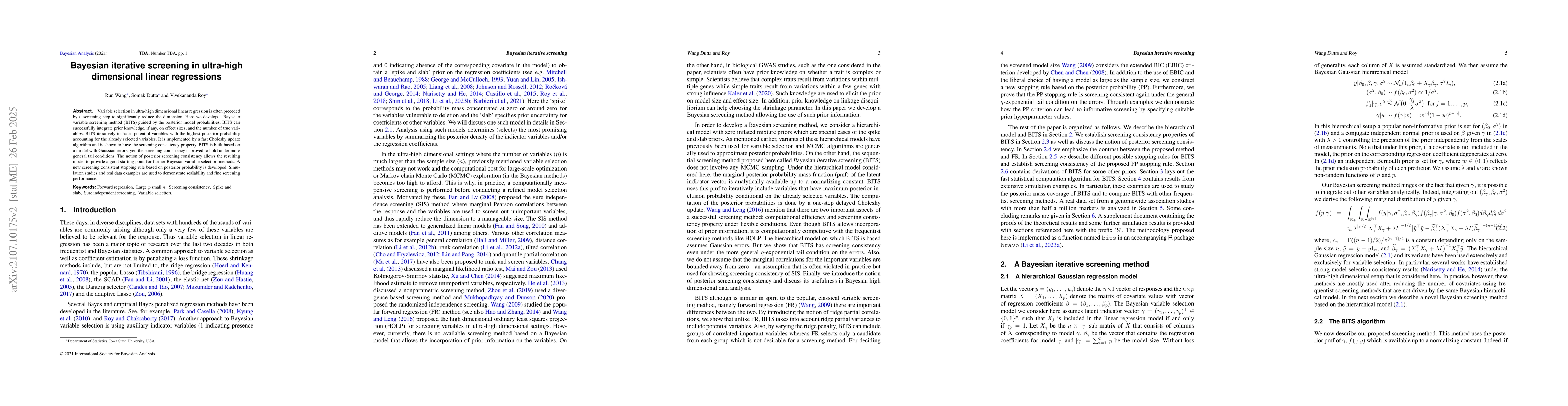Variable selection in ultra-high dimensional linear regression is often preceded by a screening step to significantly reduce the dimension. Here a Bayesian variable screening method (BITS) is developed. BITS can successfully integrate prior knowledge, if any, on effect sizes, and the number of true variables. BITS iteratively includes potential variables with the highest posterior probability accounting for the already selected variables. It is implemented by a fast Cholesky update algorithm and is shown to have the screening consistency property. BITS is built based on a model with Gaussian errors, yet, the screening consistency is proved to hold under more general tail conditions. The notion of posterior screening consistency allows the resulting model to provide a good starting point for further Bayesian variable selection methods. A new screening consistent stopping rule based on posterior probability is developed. Simulation studies and real data examples are used to demonstrate scalability and fine screening performance.