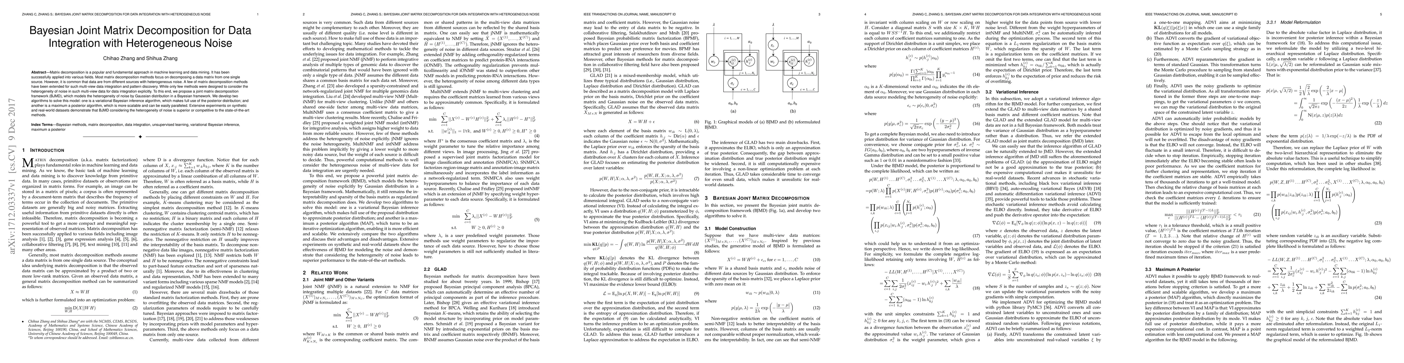 Matrix decomposition is a popular and fundamental approach in machine learning and data mining. It has been successfully applied into various fields. Most matrix decomposition methods focus on decomposing a data matrix from one single source. However, it is common that data are from different sources with heterogeneous noise. A few of matrix decomposition methods have been extended for such multi-view data integration and pattern discovery. While only few methods were designed to consider the heterogeneity of noise in such multi-view data for data integration explicitly. To this end, we propose a joint matrix decomposition framework (BJMD), which models the heterogeneity of noise by Gaussian distribution in a Bayesian framework. We develop two algorithms to solve this model: one is a variational Bayesian inference algorithm, which makes full use of the posterior distribution; and another is a maximum a posterior algorithm, which is more scalable and can be easily paralleled. Extensive experiments on synthetic and real-world datasets demonstrate that BJMD considering the heterogeneity of noise is superior or competitive to the state-of-the-art methods.