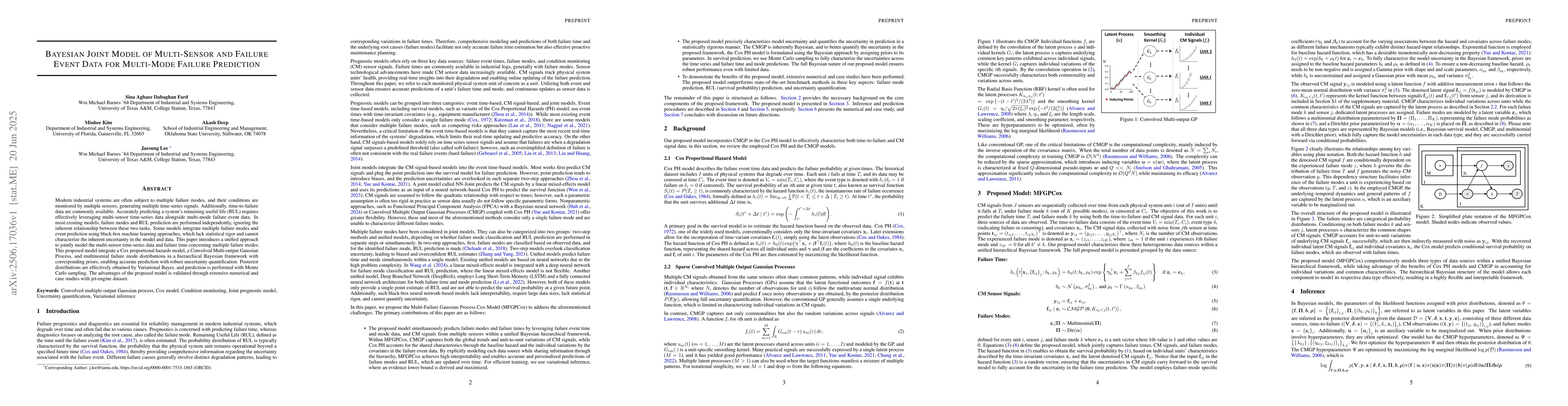 Modern industrial systems are often subject to multiple failure modes, and their conditions are monitored by multiple sensors, generating multiple time-series signals. Additionally, time-to-failure data are commonly available. Accurately predicting a system's remaining useful life (RUL) requires effectively leveraging multi-sensor time-series data alongside multi-mode failure event data. In most existing models, failure modes and RUL prediction are performed independently, ignoring the inherent relationship between these two tasks. Some models integrate multiple failure modes and event prediction using black-box machine learning approaches, which lack statistical rigor and cannot characterize the inherent uncertainty in the model and data. This paper introduces a unified approach to jointly model the multi-sensor time-series data and failure time concerning multiple failure modes. This proposed model integrate a Cox proportional hazards model, a Convolved Multi-output Gaussian Process, and multinomial failure mode distributions in a hierarchical Bayesian framework with corresponding priors, enabling accurate prediction with robust uncertainty quantification. Posterior distributions are effectively obtained by Variational Bayes, and prediction is performed with Monte Carlo sampling. The advantages of the proposed model is validated through extensive numerical and case studies with jet-engine dataset.