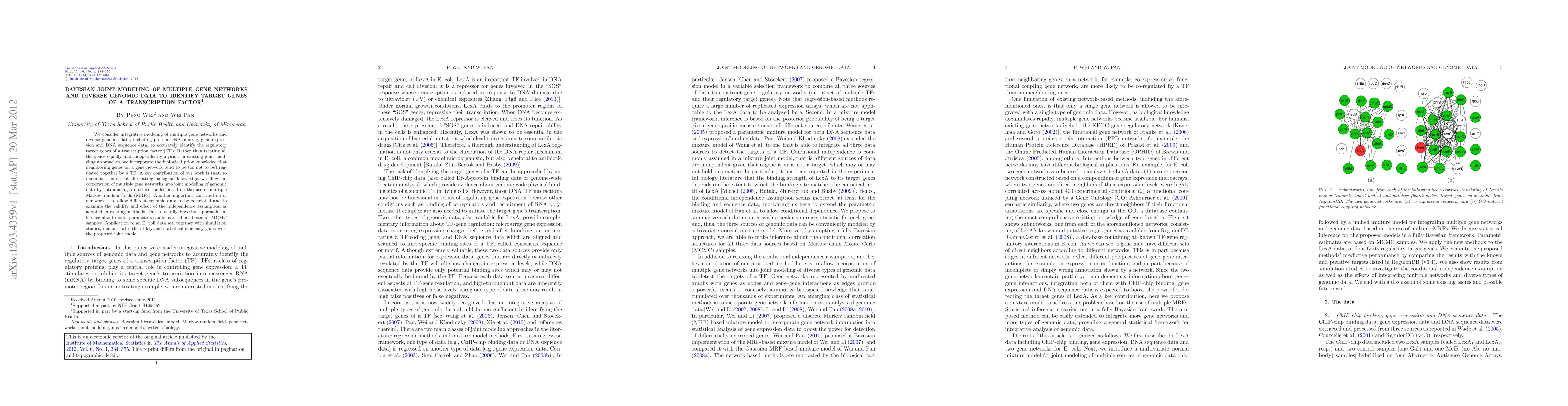 This paper proposes a Bayesian joint modeling approach that integrates multiple gene networks and diverse genomic data to identify transcription factor target genes, leveraging biological prior knowledge and employing a mixture model with multiple Markov random fields to enhance accuracy. The method allows for the correlation of different genomic data types and evaluates the independence assumption, demonstrating improved efficiency through application to an E. coli dataset.