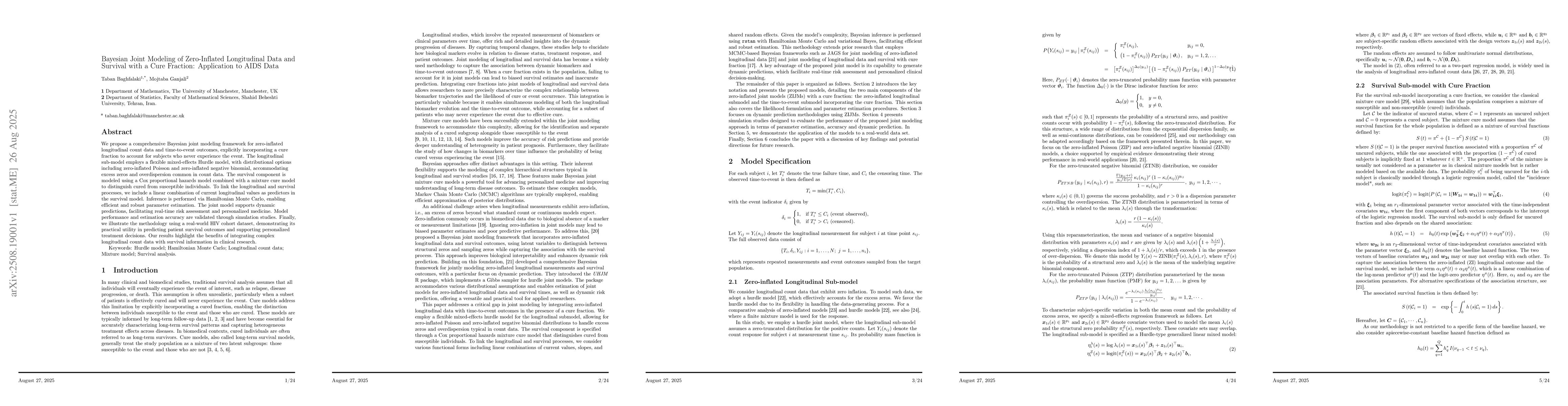 We propose a comprehensive Bayesian joint modeling framework for zero-inflated longitudinal count data and time-to-event outcomes, explicitly incorporating a cure fraction to account for subjects who never experience the event. The longitudinal sub-model employs a flexible mixed-effects Hurdle model, with distributional options including zero-inflated Poisson and zero-inflated negative binomial, accommodating excess zeros and overdispersion common in count data. The survival component is modeled using a Cox proportional hazards model combined with a mixture cure model to distinguish cured from susceptible individuals. To link the longitudinal and survival processes, we include a linear combination of current longitudinal values as predictors in the survival model. Inference is performed via Hamiltonian Monte Carlo, enabling efficient and robust parameter estimation. The joint model supports dynamic predictions, facilitating real-time risk assessment and personalized medicine. Model performance and estimation accuracy are validated through simulation studies. Finally, we illustrate the methodology using a real-world HIV cohort dataset, demonstrating its practical utility in predicting patient survival outcomes and supporting personalized treatment decisions. Our results highlight the benefits of integrating complex longitudinal count data with survival information in clinical research.