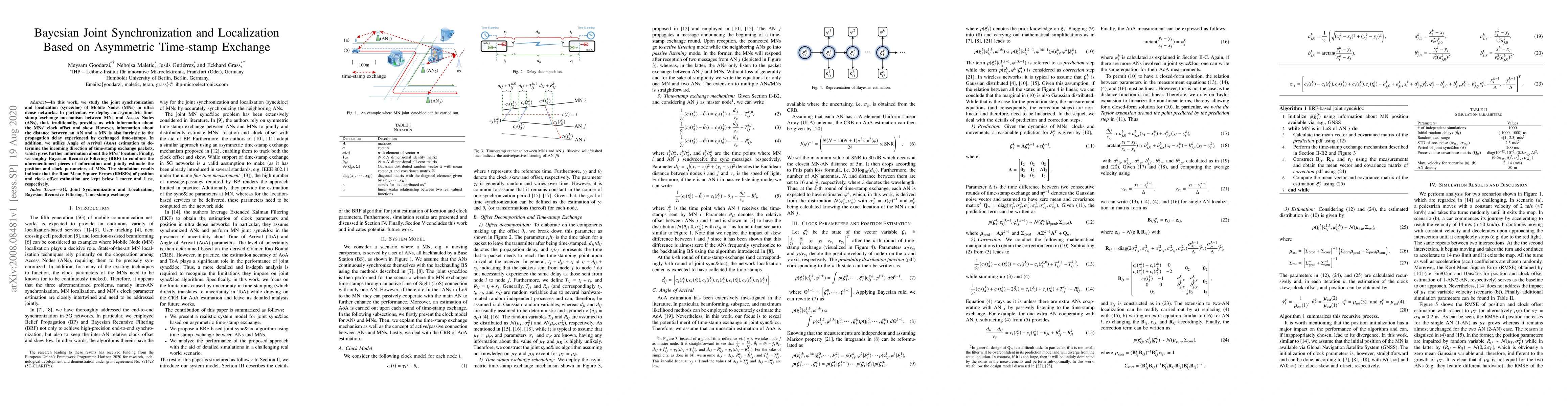 This paper proposes a Bayesian method to synchronize and localize mobile nodes in ultra-dense networks using asymmetric timestamp exchange and Angle of Arrival estimation, achieving accurate position and clock parameter estimations.