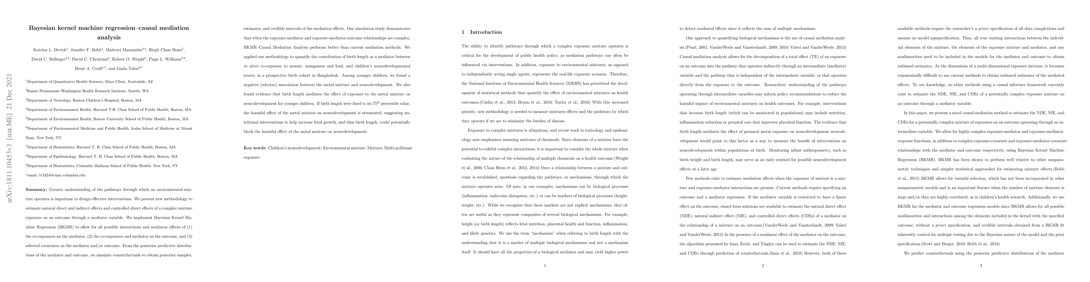 A new method using Bayesian Kernel Machine Regression (BKMR) estimates natural direct and indirect effects of environmental exposure on an outcome through a mediator variable, suggesting nutritional interventions can block the harmful effect of metal mixture on neurodevelopment.