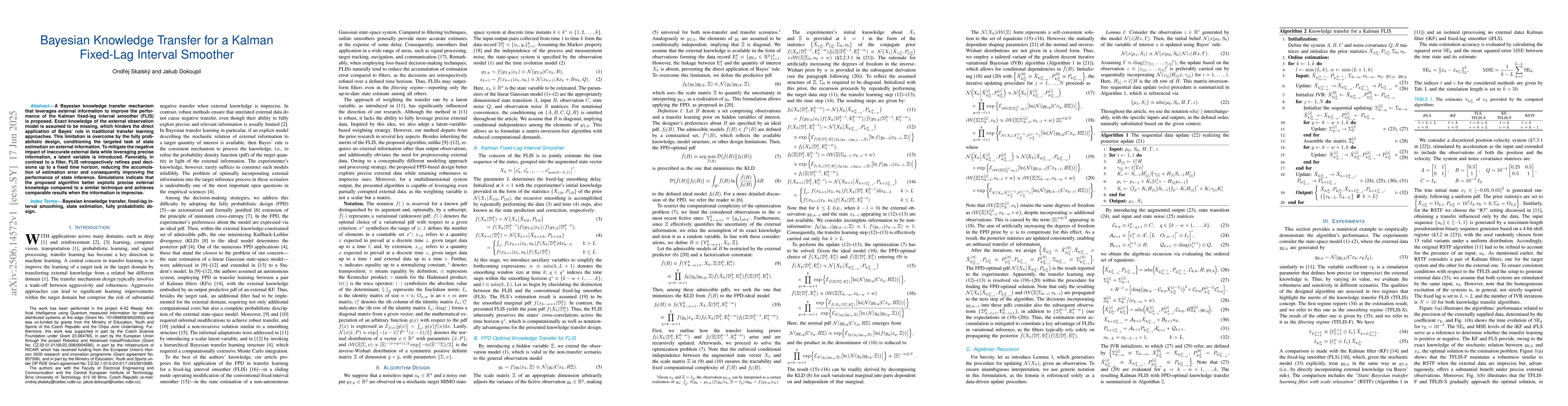 A Bayesian knowledge transfer mechanism that leverages external information to improve the performance of the Kalman fixed-lag interval smoother (FLIS) is proposed. Exact knowledge of the external observation model is assumed to be missing, which hinders the direct application of Bayes' rule in traditional transfer learning approaches. This limitation is overcome by the fully probabilistic design, conditioning the targeted task of state estimation on external information. To mitigate the negative impact of inaccurate external data while leveraging precise information, a latent variable is introduced. Favorably, in contrast to a filter, FLIS retrospectively refines past decisions up to a fixed time horizon, reducing the accumulation of estimation error and consequently improving the performance of state inference. Simulations indicate that the proposed algorithm better exploits precise external knowledge compared to a similar technique and achieves comparable results when the information is imprecise.