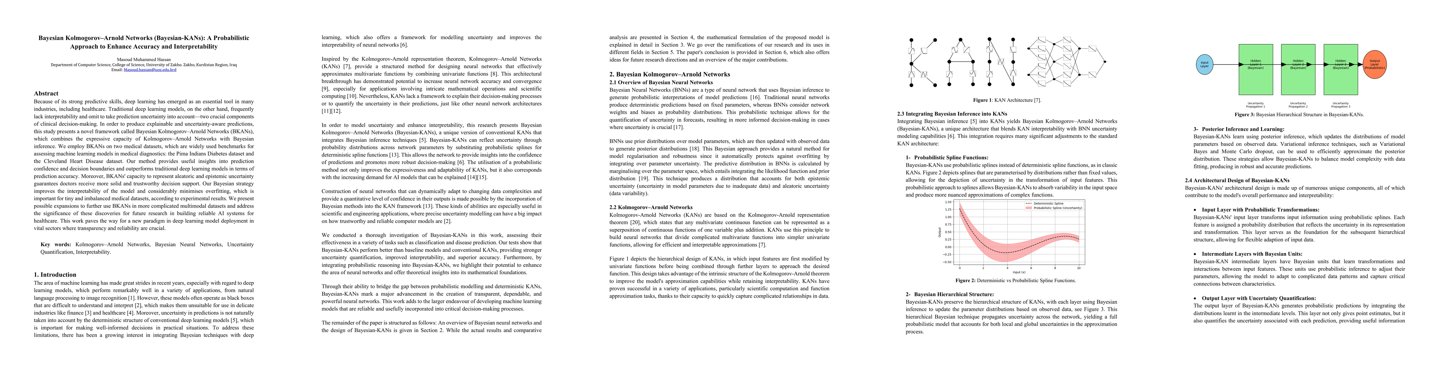 This paper introduces Bayesian Kolmogorov Arnold Networks (BKANs) to enhance both accuracy and interpretability in deep learning, addressing prediction uncertainty crucial for healthcare decision-making. BKANs outperform traditional deep learning models in accuracy while providing insights into prediction confidence and decision boundaries, offering a new paradigm for reliable AI deployment in healthcare.