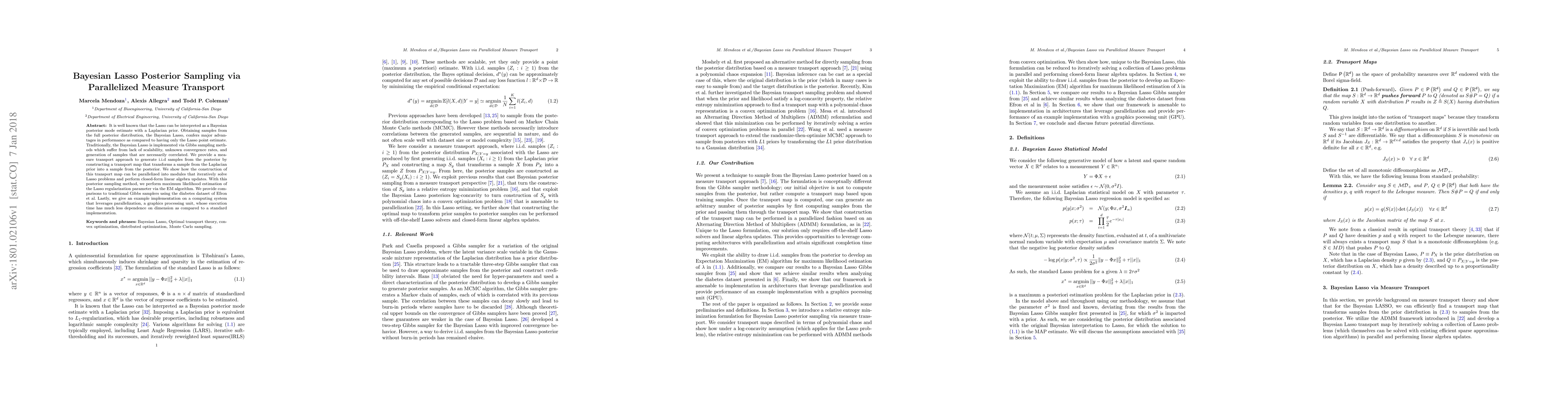 It is well known that the Lasso can be interpreted as a Bayesian posterior mode estimate with a Laplacian prior. Obtaining samples from the full posterior distribution, the Bayesian Lasso, confers major advantages in performance as compared to having only the Lasso point estimate. Traditionally, the Bayesian Lasso is implemented via Gibbs sampling methods which suffer from lack of scalability, unknown convergence rates, and generation of samples that are necessarily correlated. We provide a measure transport approach to generate i.i.d samples from the posterior by constructing a transport map that transforms a sample from the Laplacian prior into a sample from the posterior. We show how the construction of this transport map can be parallelized into modules that iteratively solve Lasso problems and perform closed-form linear algebra updates. With this posterior sampling method, we perform maximum likelihood estimation of the Lasso regularization parameter via the EM algorithm. We provide comparisons to traditional Gibbs samplers using the diabetes dataset of Efron et al. Lastly, we give an example implementation on a computing system that leverages parallelization, a graphics processing unit, whose execution time has much less dependence on dimension as compared to a standard implementation.