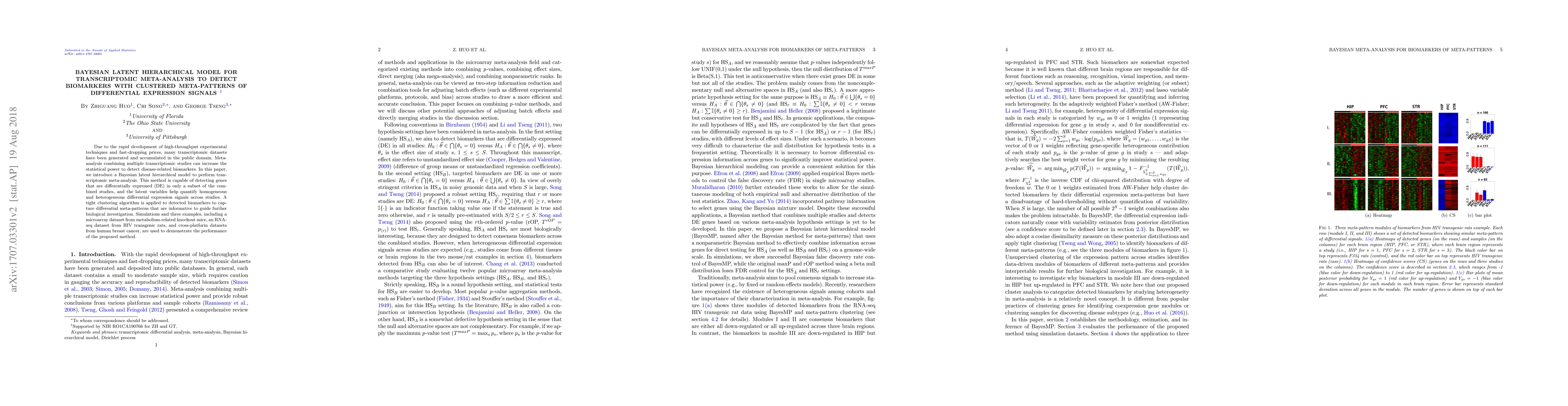 This paper proposes a Bayesian latent hierarchical model for transcriptomic meta-analysis to identify disease-related biomarkers with differential expression patterns across subsets of studies. The method effectively captures both homogeneous and heterogeneous expression signals and uses clustering to guide further biological investigation.