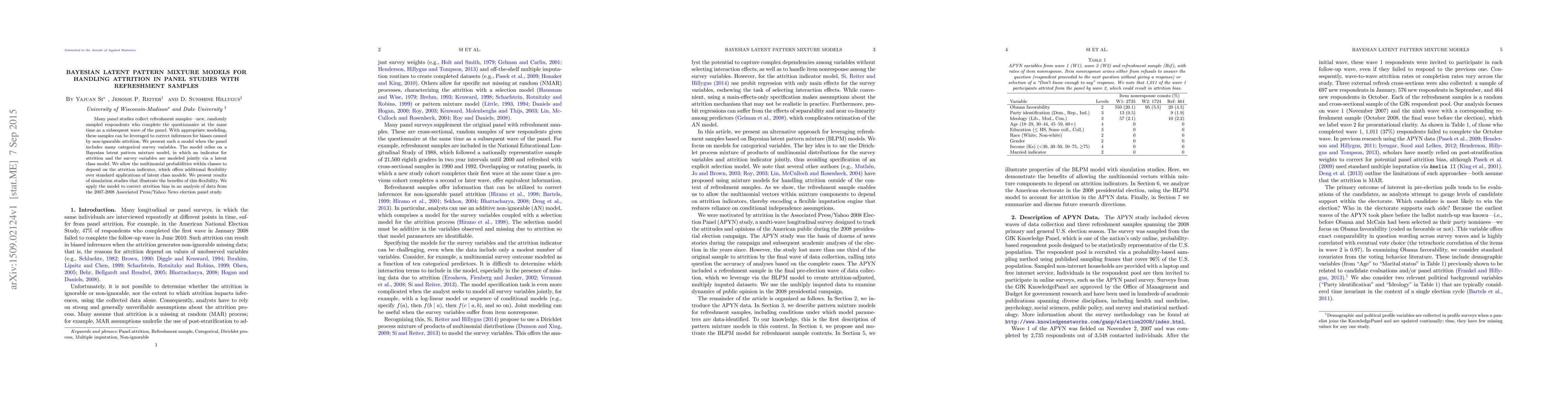 This paper introduces a Bayesian latent pattern mixture model to address attrition in panel studies using refreshment samples. It leverages a latent class model to jointly model attrition and categorical survey variables, allowing for flexible multinomial probabilities dependent on the attrition indicator, which enhances standard latent class models. Simulation studies and an application to the 2007-2008 Associated Press/Yahoo News election panel study demonstrate the model's effectiveness in correcting attrition bias.