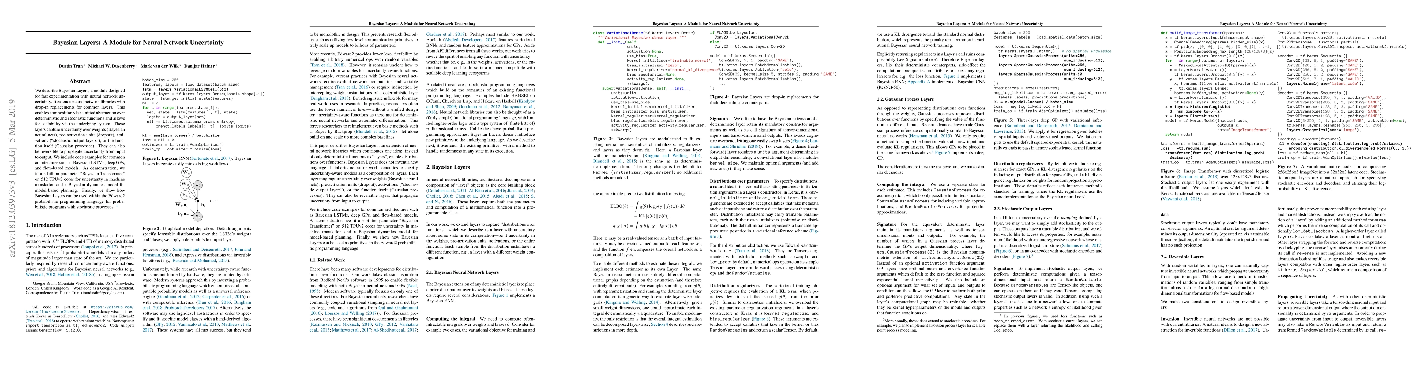 Bayesian Layers is a module for neural networks that introduces uncertainty through drop-in replacements for common layers, enabling scalable and reversible uncertainty propagation in models like Bayesian LSTMs and deep GPs. This module demonstrates practical applications in machine translation and model-based planning.
