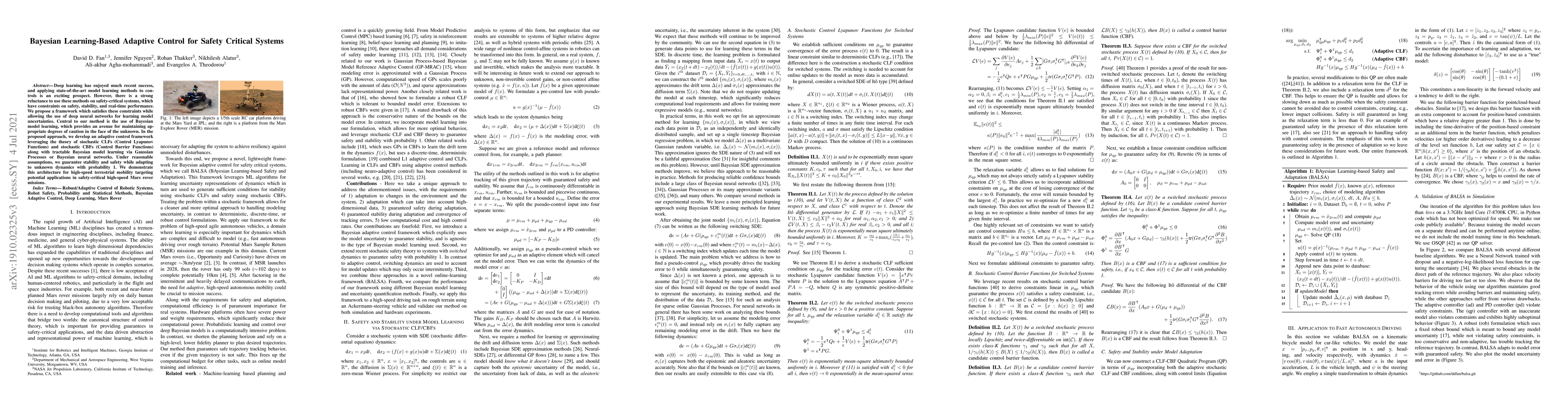 This paper proposes a Bayesian learning-based adaptive control framework for safety-critical systems, utilizing deep learning with Gaussian Processes or Bayesian neural networks to manage uncertainties. The framework guarantees stability and safety through stochastic CLFs and CBFs, demonstrating its potential in high-speed terrestrial mobility, such as Mars rover missions.
