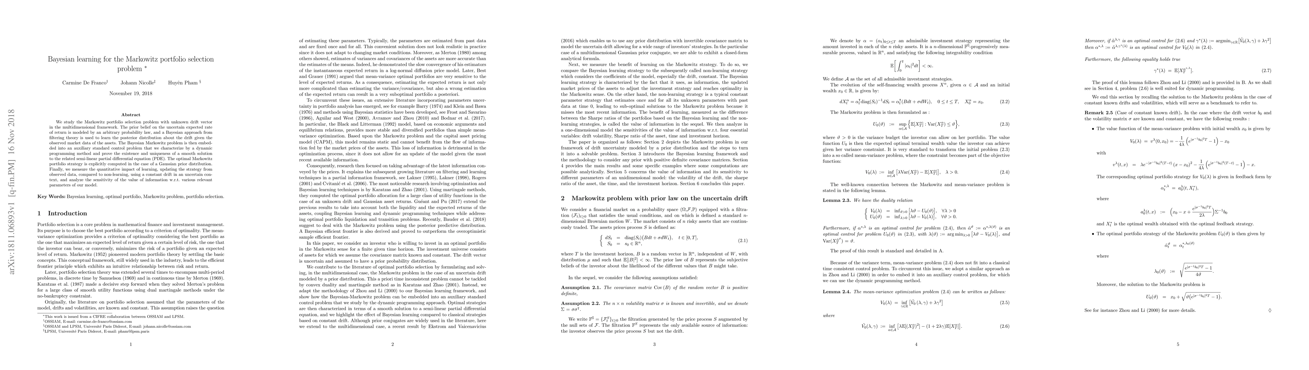 This paper explores the Bayesian approach to the Markowitz portfolio selection problem with unknown drift vectors, using filtering theory to update beliefs on expected returns based on market data. It derives an optimal portfolio strategy under a Gaussian prior and analyzes the value of learning compared to a non-learning approach, assessing sensitivity to model parameters.