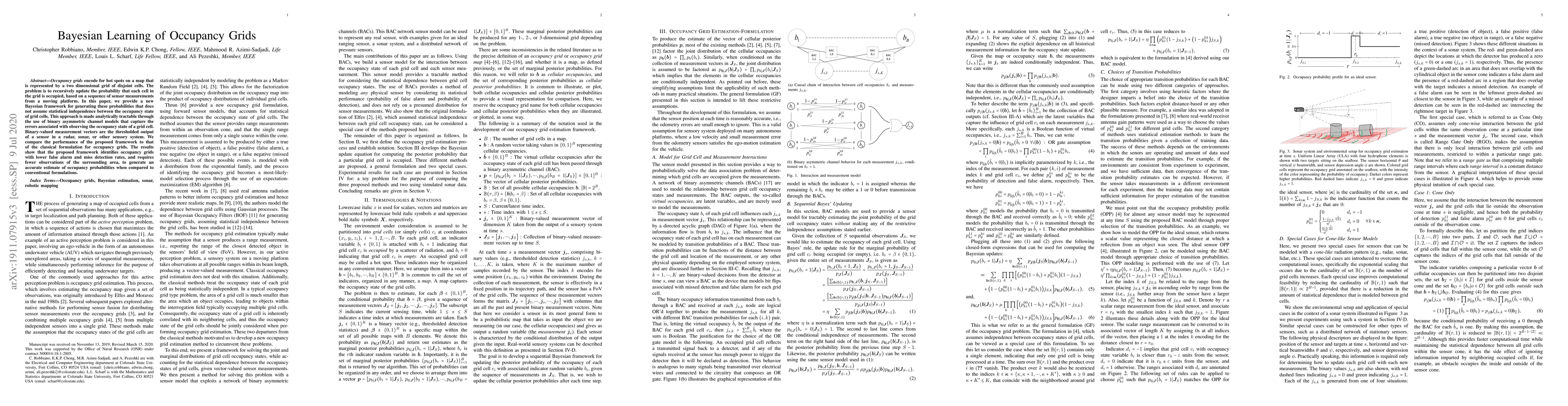 Occupancy grids encode for hot spots on a map that is represented by a two dimensional grid of disjoint cells. The problem is to recursively update the probability that each cell in the grid is occupied, based on a sequence of sensor measurements from a moving platform. In this paper, we provide a new Bayesian framework for generating these probabilities that does not assume statistical independence between the occupancy state of grid cells. This approach is made analytically tractable through the use of binary asymmetric channel models that capture the errors associated with observing the occupancy state of a grid cell. Binary-valued measurement vectors are the thresholded output of a sensor in a radar, sonar, or other sensory system. We compare the performance of the proposed framework to that of the classical formulation for occupancy grids. The results show that the proposed framework identifies occupancy grids with lower false alarm and miss detection rates, and requires fewer observations of the surrounding area, to generate an accurate estimate of occupancy probabilities when compared to conventional formulations.