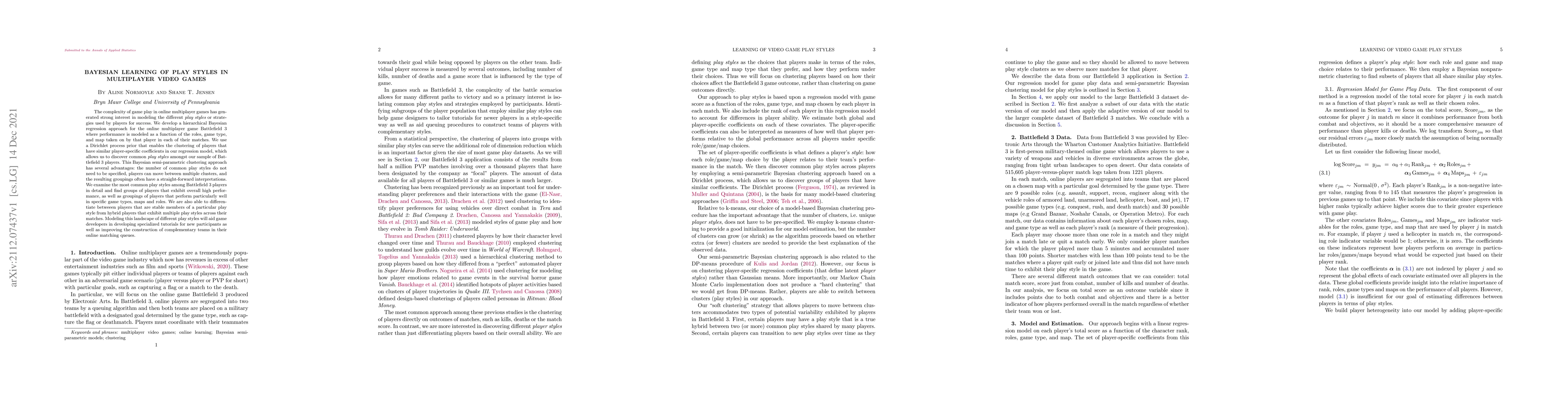 This paper develops a Bayesian regression approach to model and cluster play styles in Battlefield 3 multiplayer players, discovering common strategies and performance patterns based on roles, game types, and maps. The method identifies distinct play styles without pre-specifying their number, aiding game developers in tailoring tutorials and team compositions.