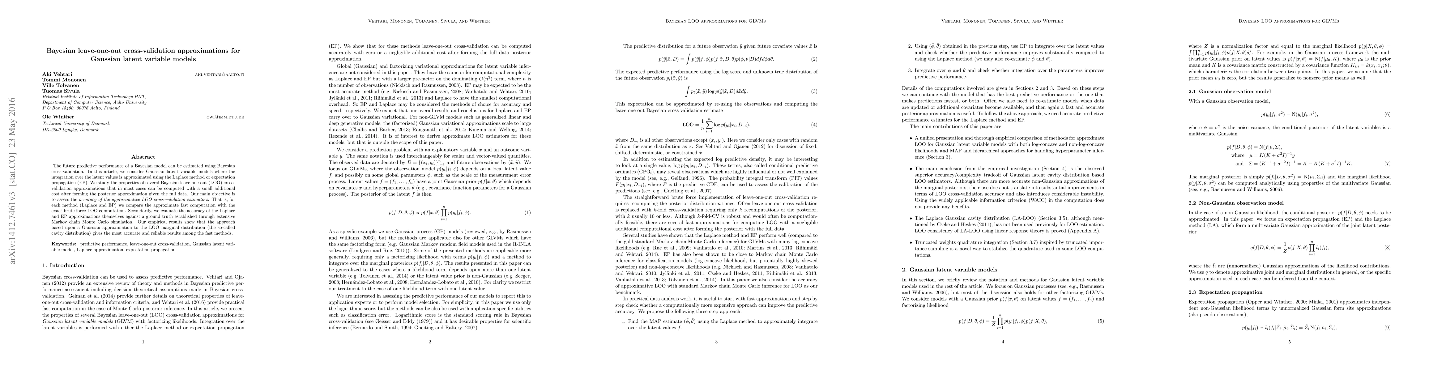 This paper evaluates Bayesian leave-one-out cross-validation approximations for Gaussian latent variable models, comparing the accuracy of fast methods like Laplace and expectation propagation against exact computations. The Gaussian approximation to the LOO marginal distribution (cavity distribution) is found to provide the most accurate results.
