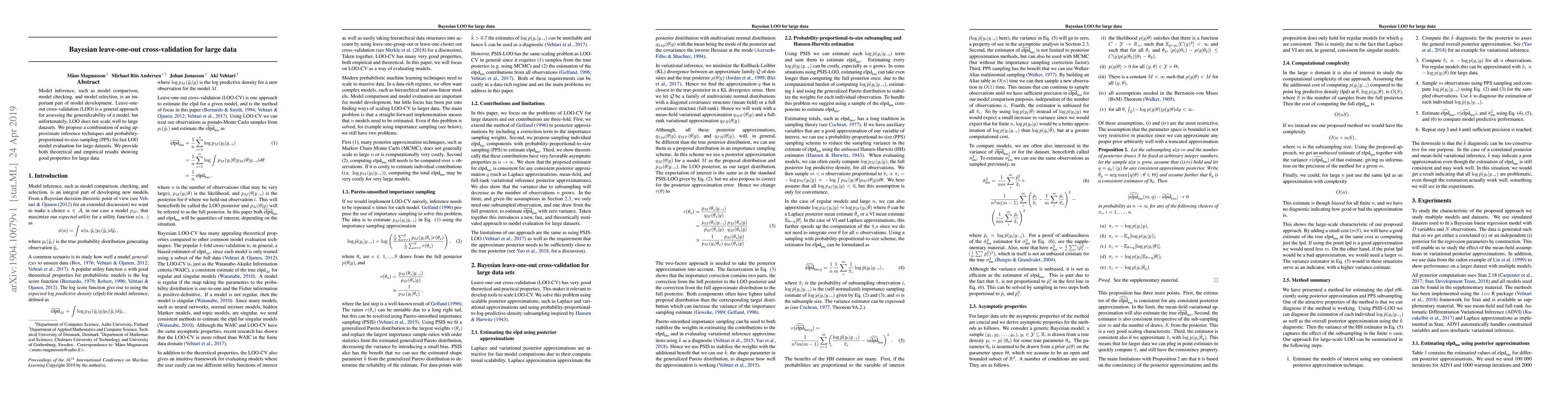 This paper proposes a Bayesian leave-one-out cross-validation method combining approximate inference and probability-proportional-to-size-sampling for efficient model evaluation on large datasets. Theoretical and empirical results demonstrate its effectiveness and scalability.