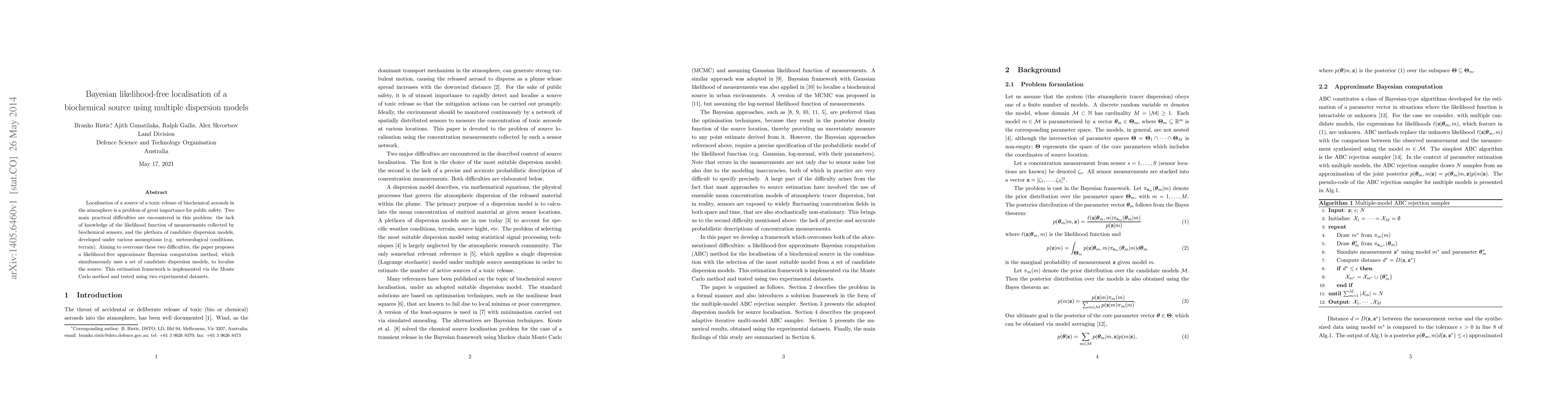 Localisation of a source of a toxic release of biochemical aerosols in the atmosphere is a problem of great importance for public safety. Two main practical difficulties are encountered in this problem: the lack of knowledge of the likelihood function of measurements collected by biochemical sensors, and the plethora of candidate dispersion models, developed under various assumptions (e.g. meteorological conditions, terrain). Aiming to overcome these two difficulties, the paper proposes a likelihood-free approximate Bayesian computation method, which simultaneously uses a set of candidate dispersion models, to localise the source. This estimation framework is implemented via the Monte Carlo method and tested using two experimental datasets.
