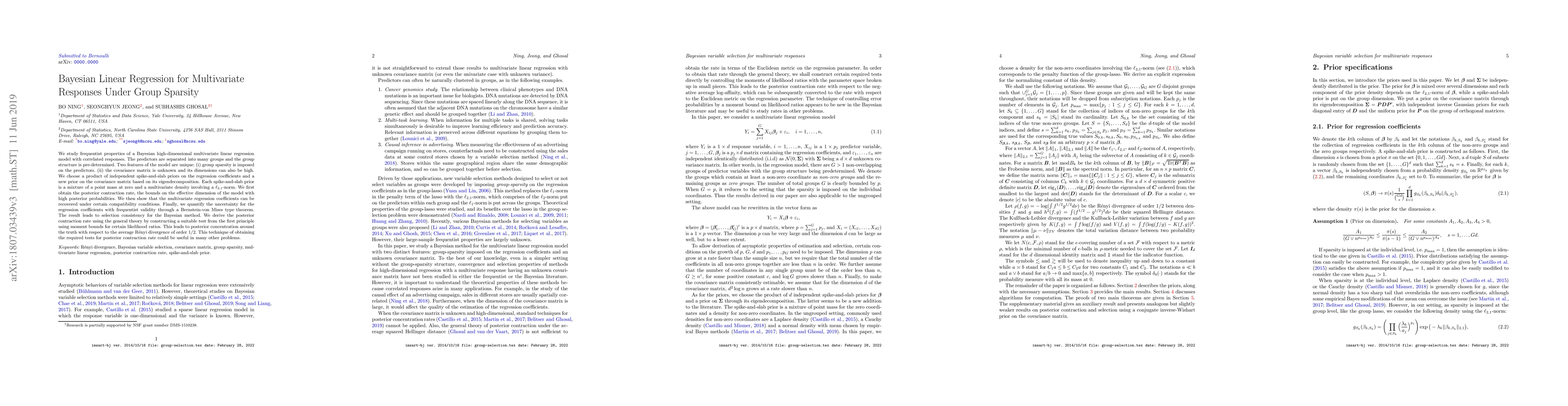 The paper studies the frequentist properties of a Bayesian high-dimensional multivariate linear regression model with correlated responses, employing group sparsity on predictors and an unknown, potentially high-dimensional covariance matrix with a product of independent spike-and-slab priors on regression coefficients and a new prior on the covariance matrix based on its eigendecomposition.