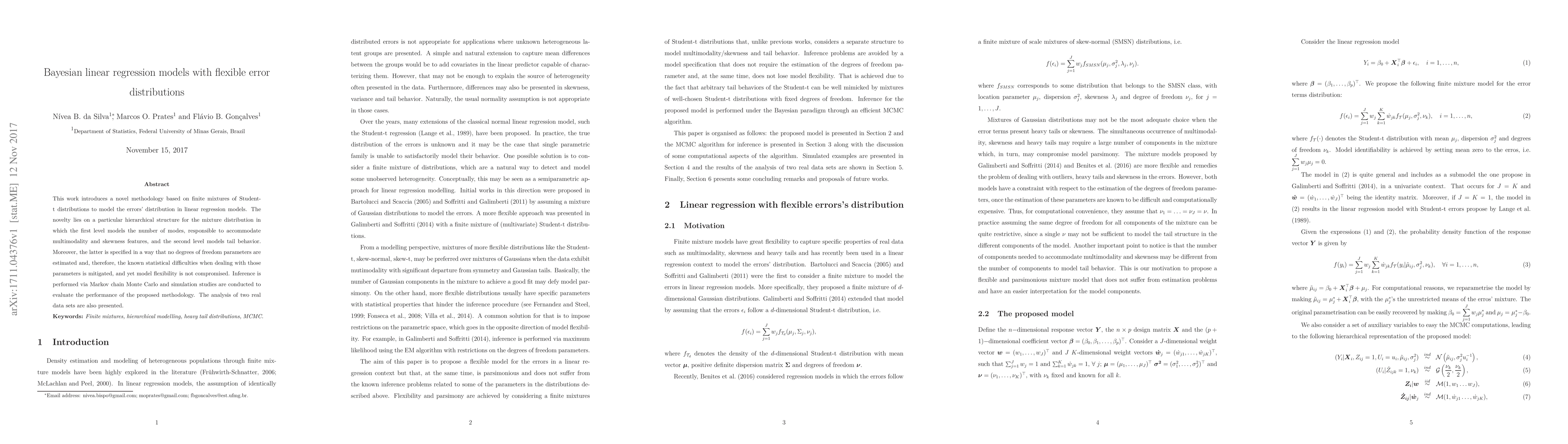 The paper introduces a Bayesian linear regression model using finite mixtures of Student-t distributions for error terms, with a hierarchical structure for the mixture distribution that models the number of modes and tail behavior without estimating degrees of freedom parameters.